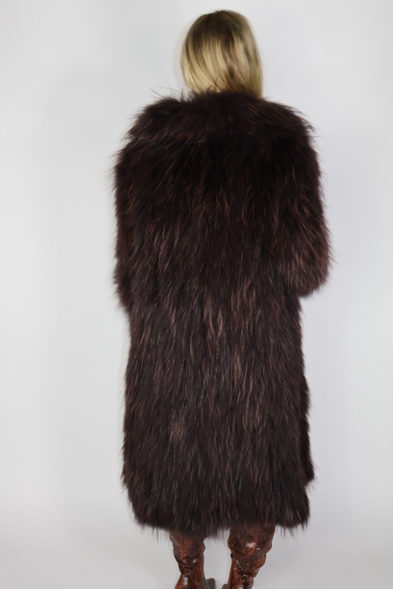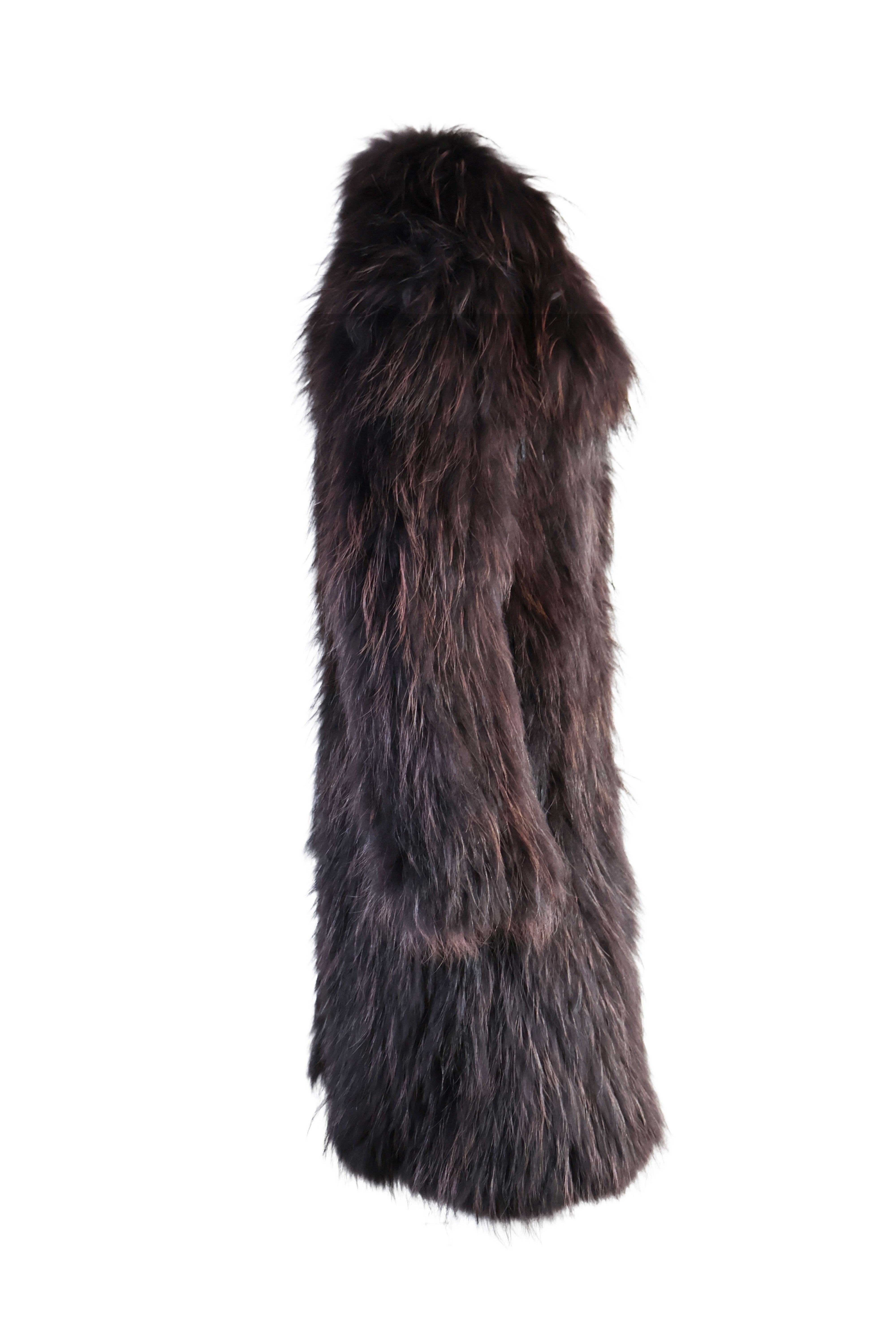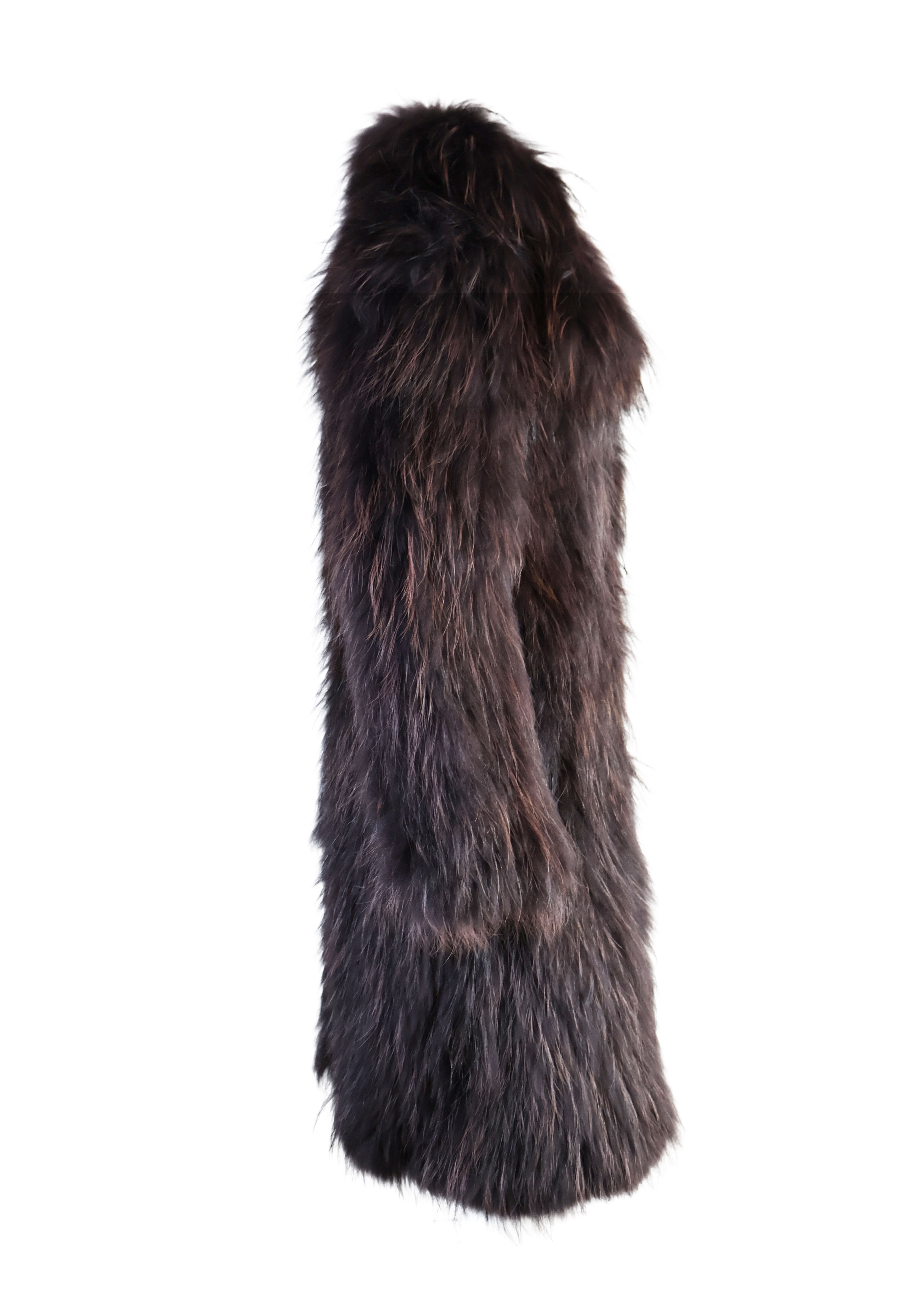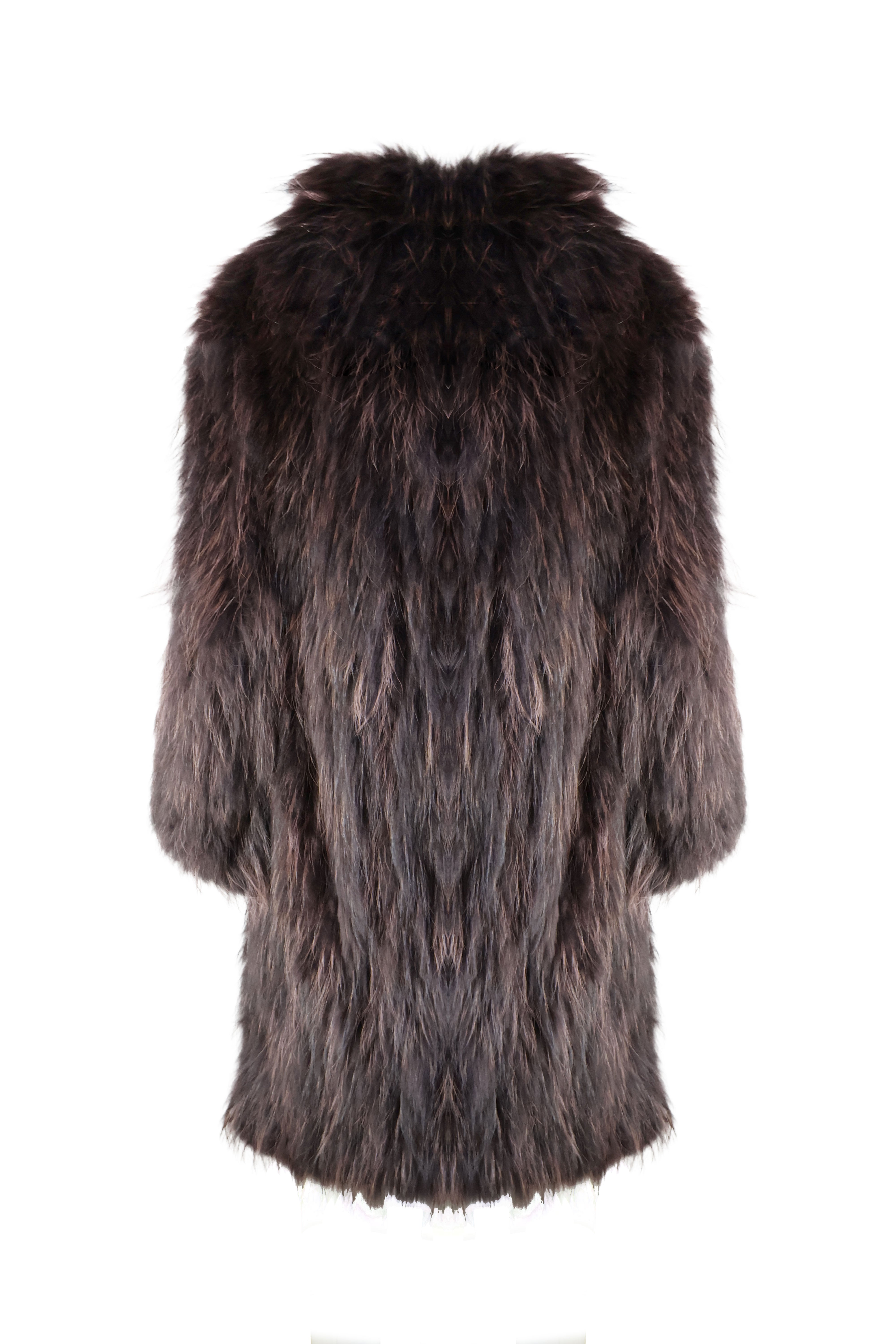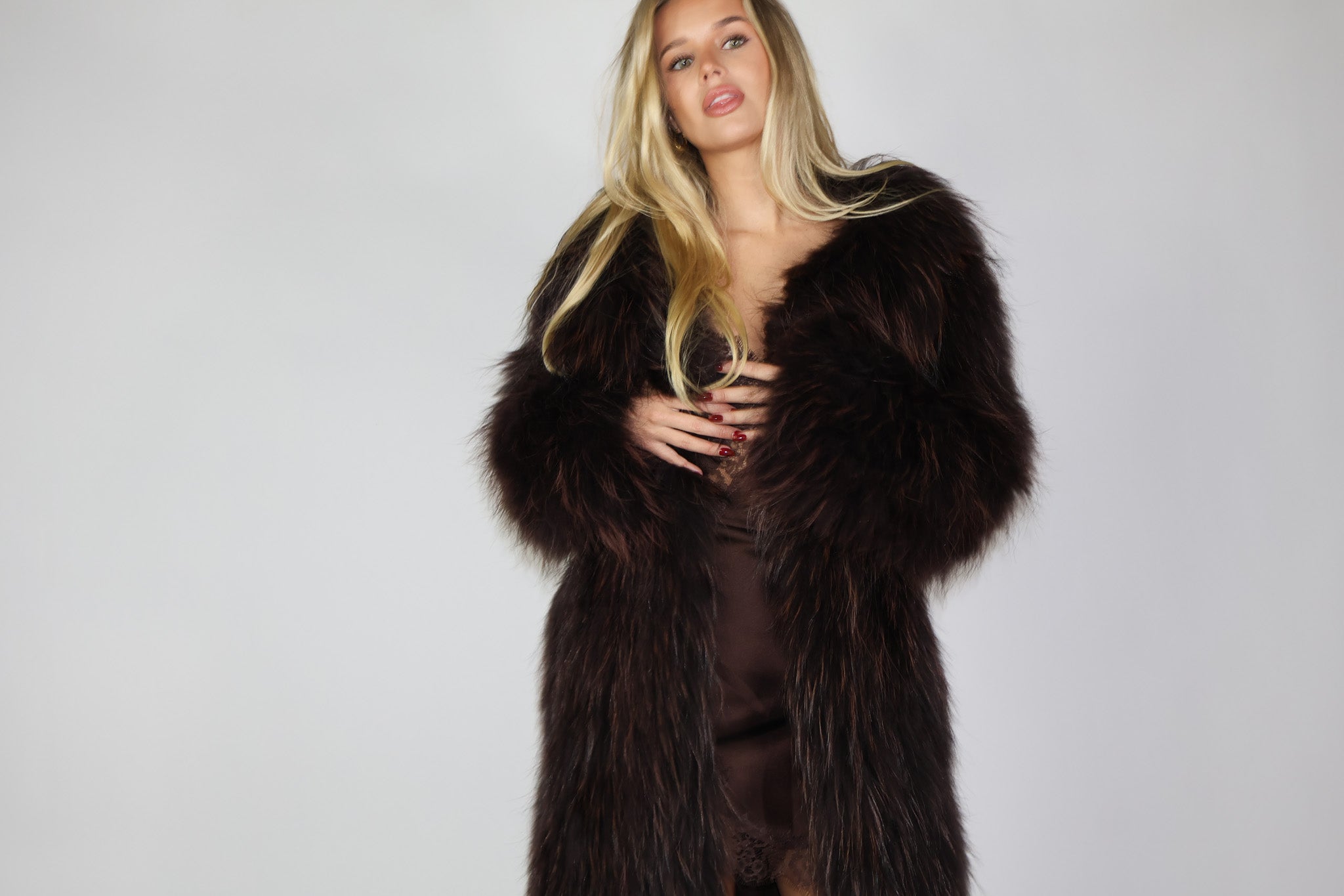 This incredibly lightweight longline fur coat is knitted by hand using luxurious 100% raccoon fur outer & lining. Bold overturned collar and wide lapels make an elegant statement while draping effortlessly over your frame, the unstructured design of the Aster Long Fur Coat contours your silhouette making it extremely easy to wear.