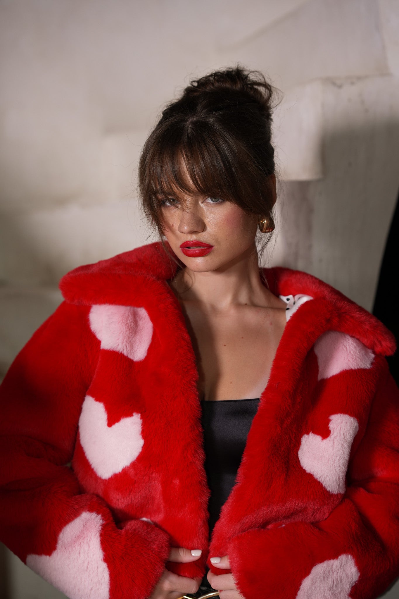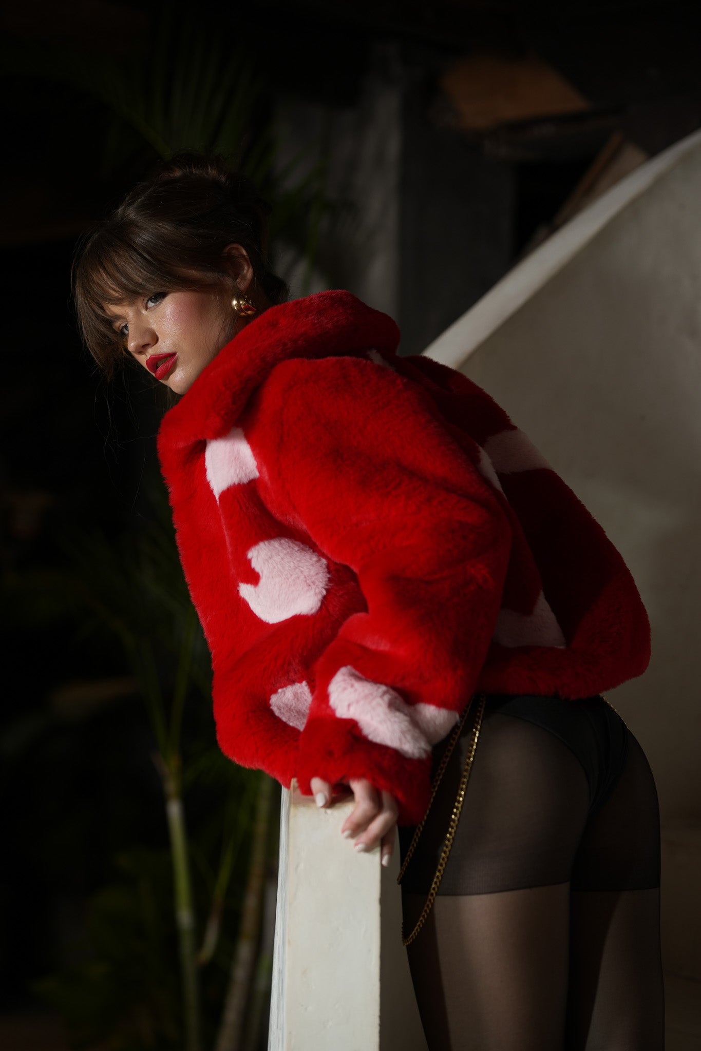 Wear your heart on your sleeve (literally!) in the Queen Of Hearts Faux Mid Coat. We've emulated our magnificent Queen of Hearts pink fur coat and created this enchanting faux mid coat version just for you. Equal part feminine and rockstar glam, this charismatic piece will turn heads this winter.