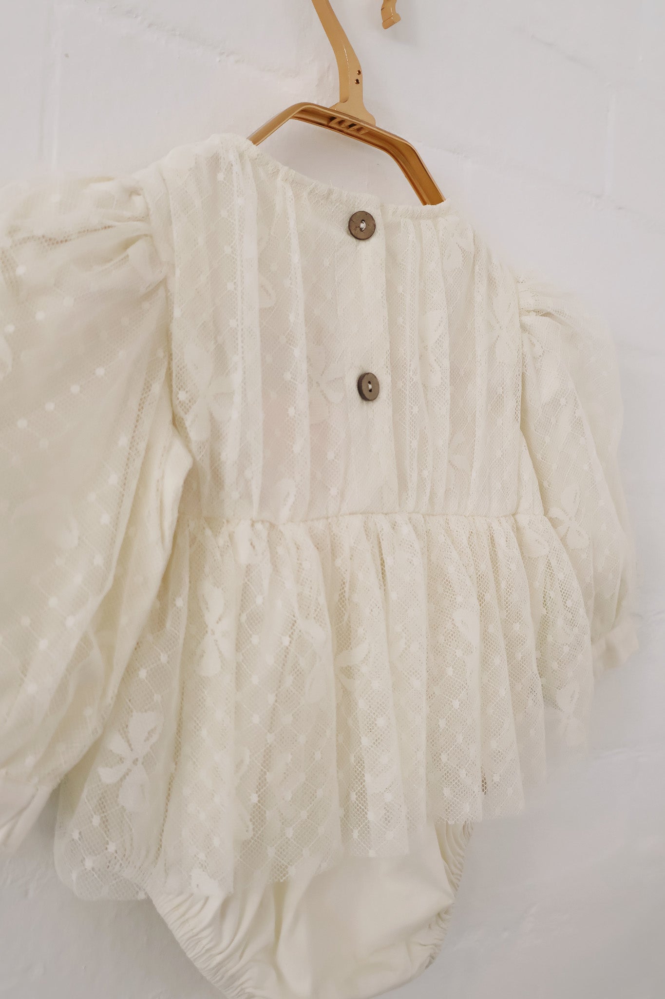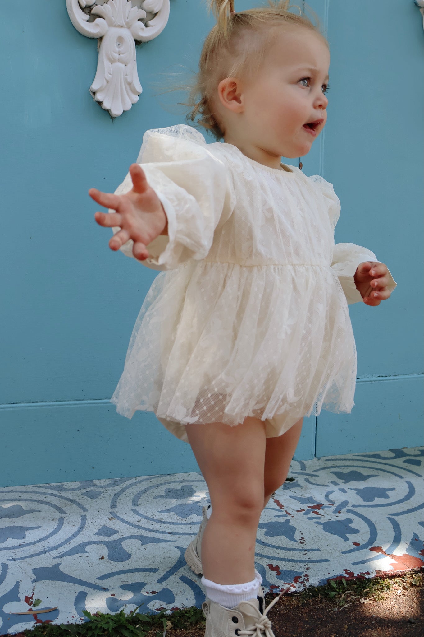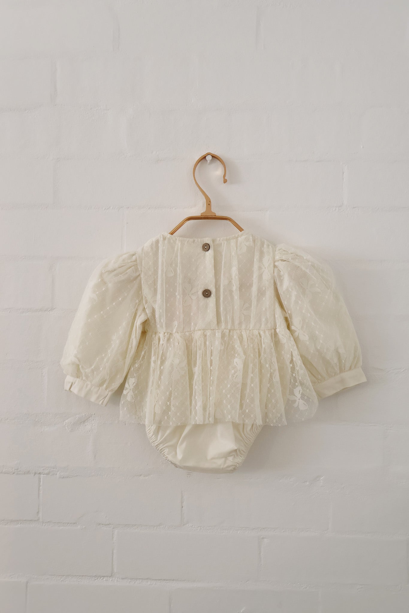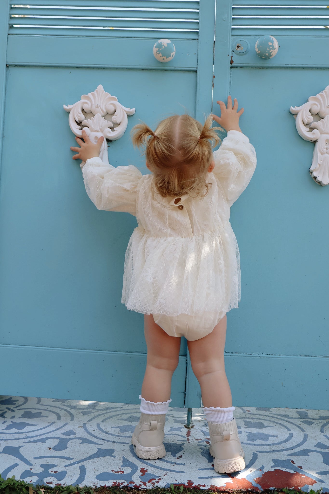 Delicate, dreamy, and effortlessly enchanting, the Tommi Romper is a vision of timeless beauty. Designed for little ones who deserve nothing less than magic, this long-sleeve romper is adorned with an intricate lace overlay, evoking an air of vintage romance.