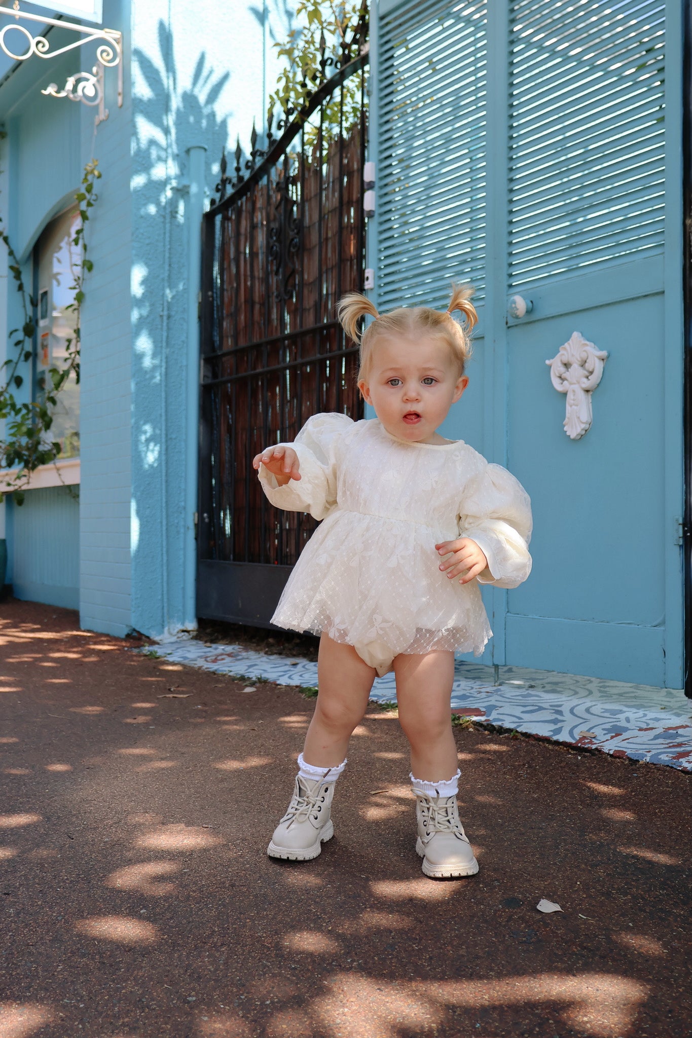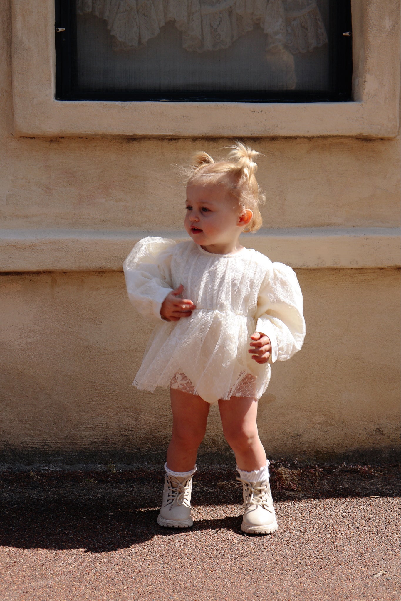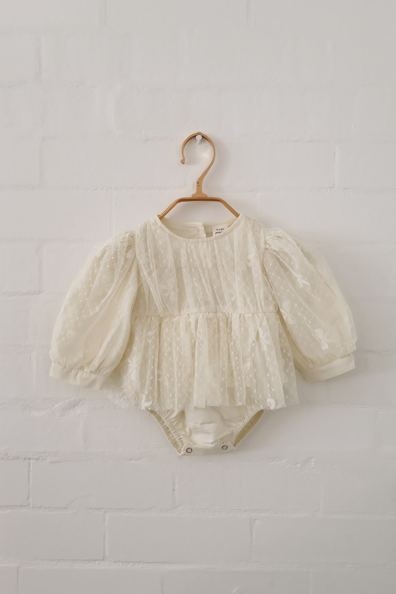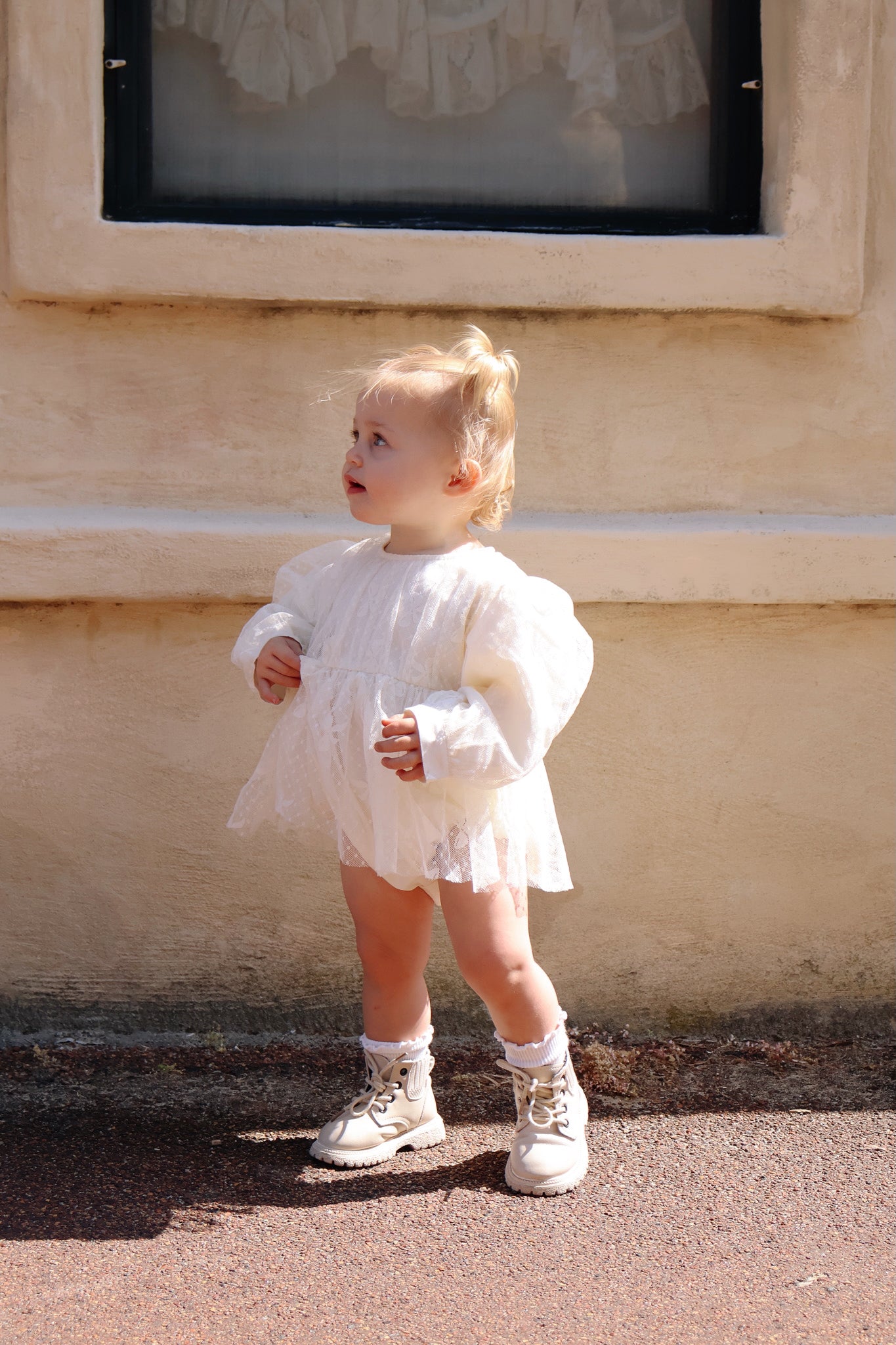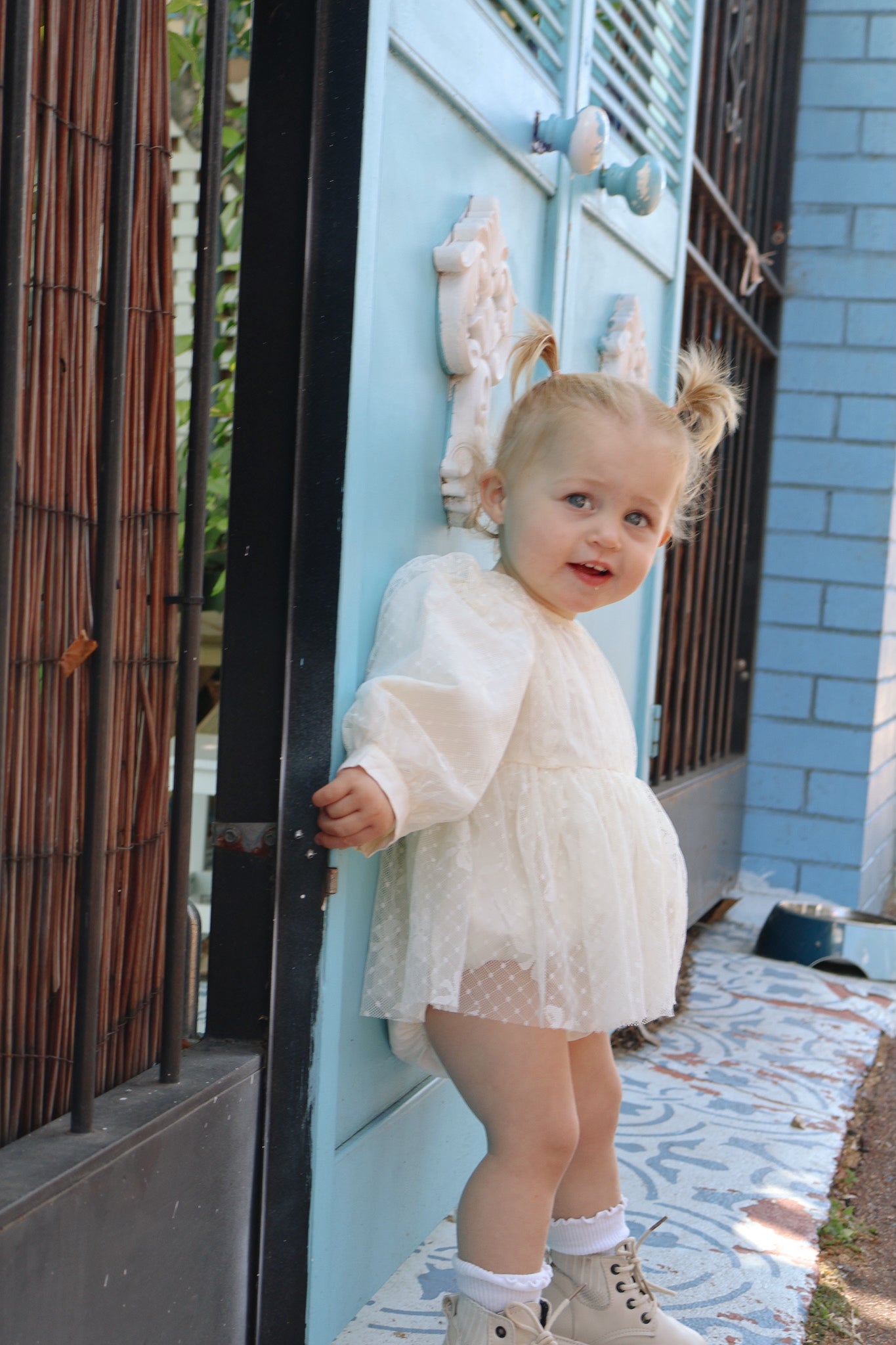 Delicate, dreamy, and effortlessly enchanting, the Tommi Romper is a vision of timeless beauty. Designed for little ones who deserve nothing less than magic, this long-sleeve romper is adorned with an intricate lace overlay, evoking an air of vintage romance.