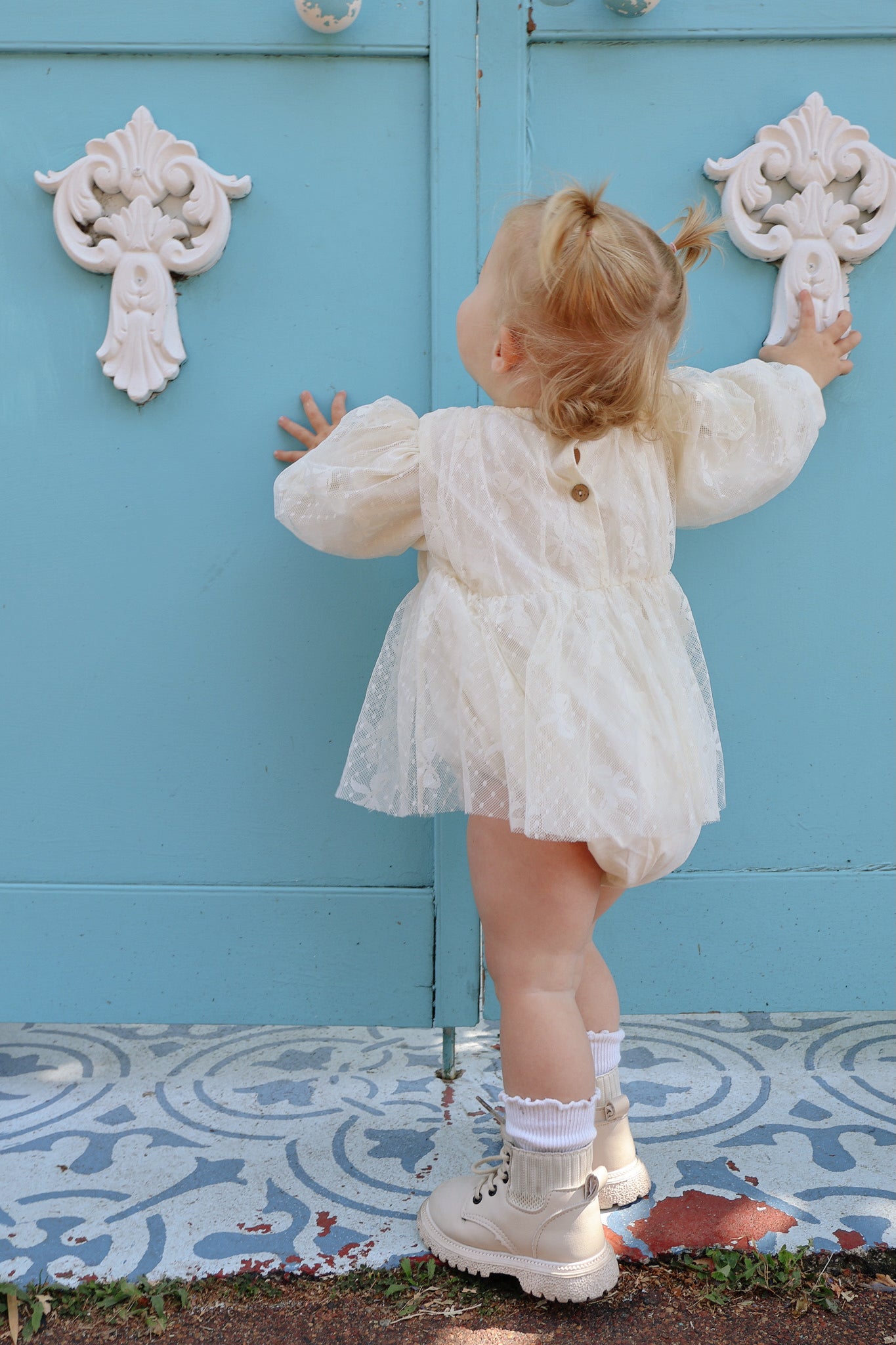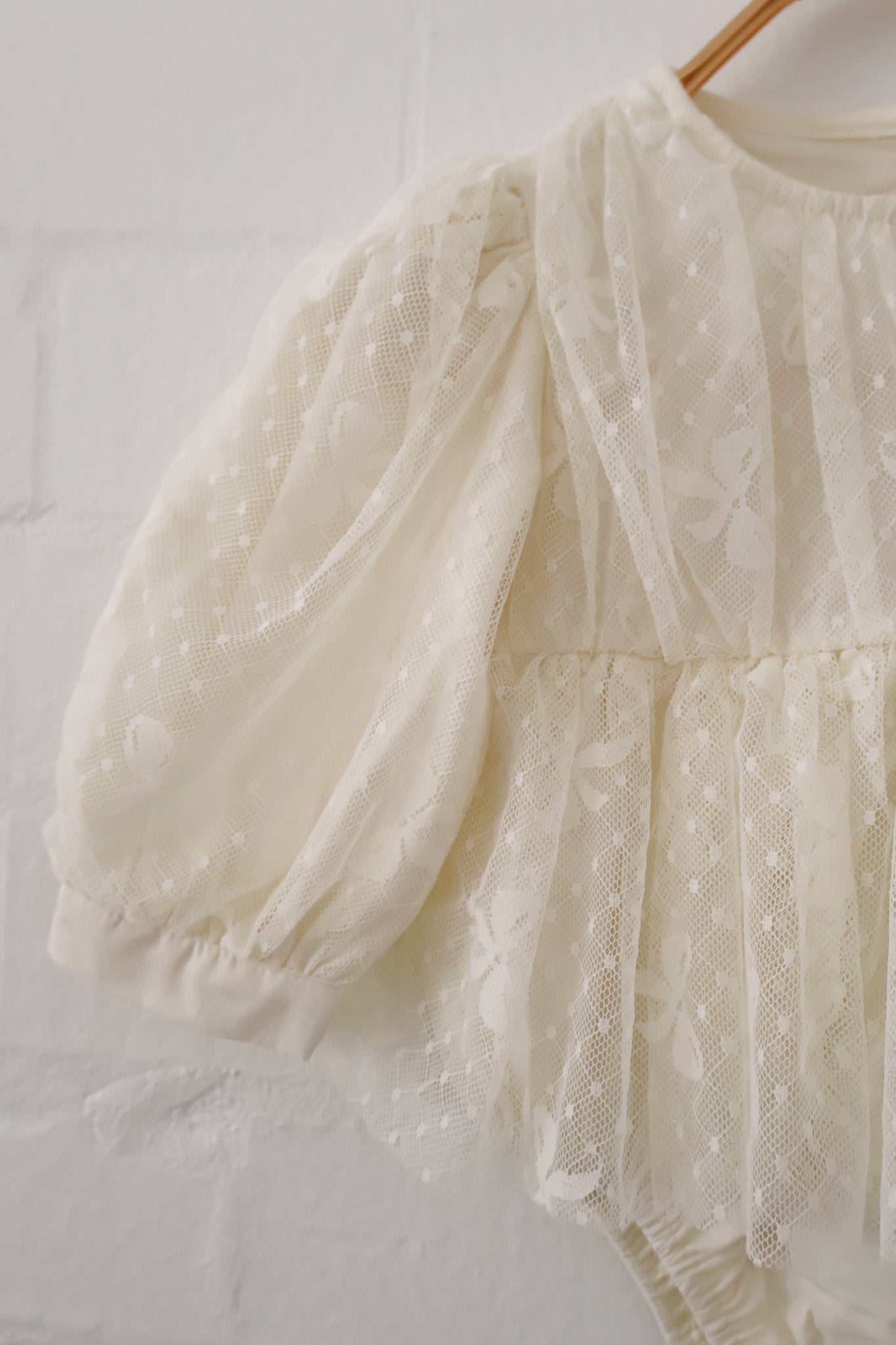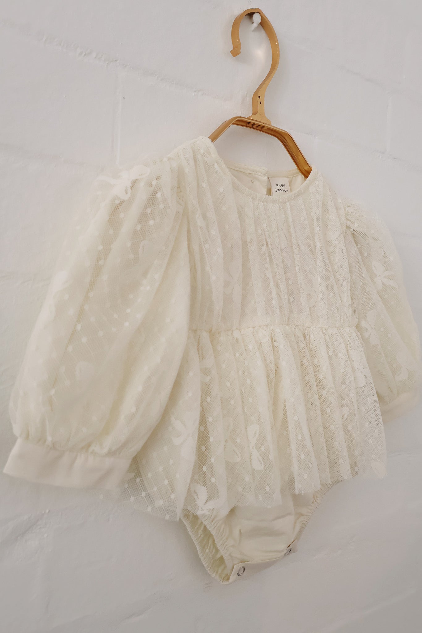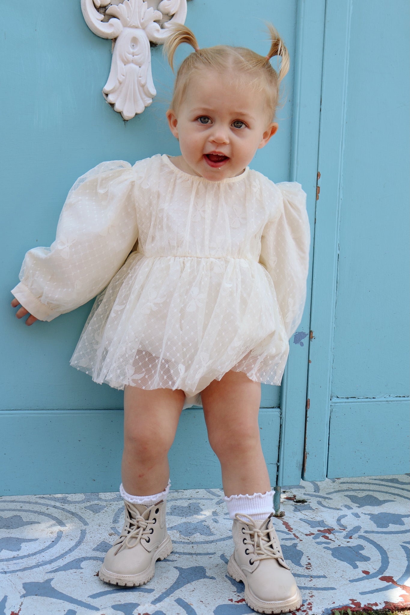 Delicate, dreamy, and effortlessly enchanting, the Tommi Romper is a vision of timeless beauty. Designed for little ones who deserve nothing less than magic, this long-sleeve romper is adorned with an intricate lace overlay, evoking an air of vintage romance.