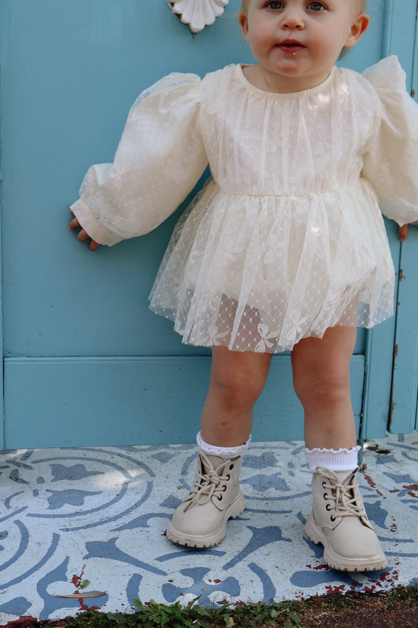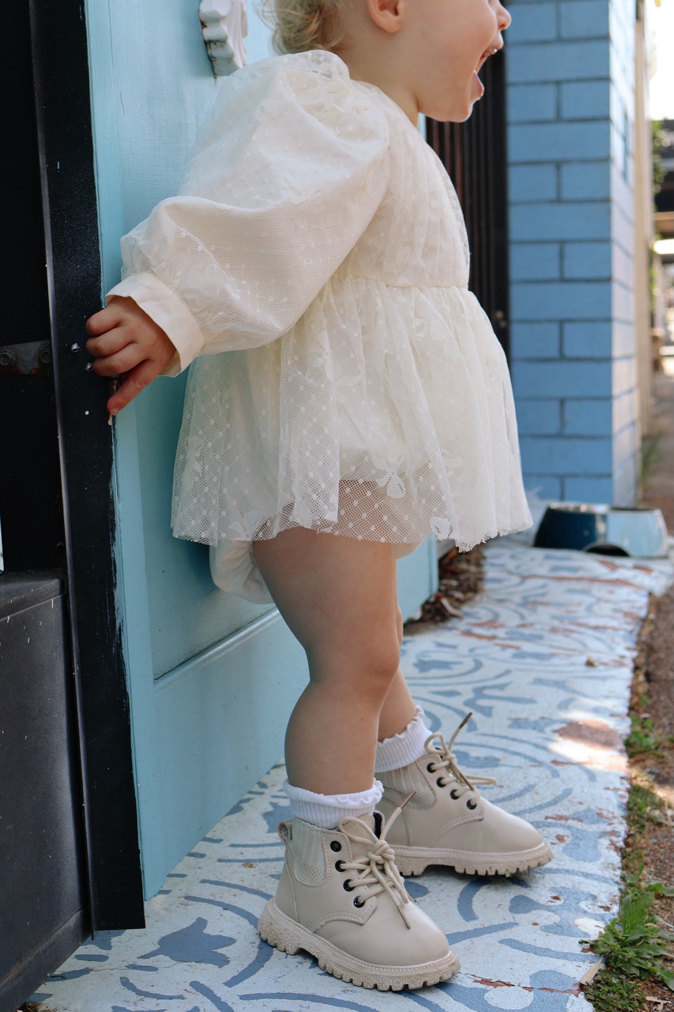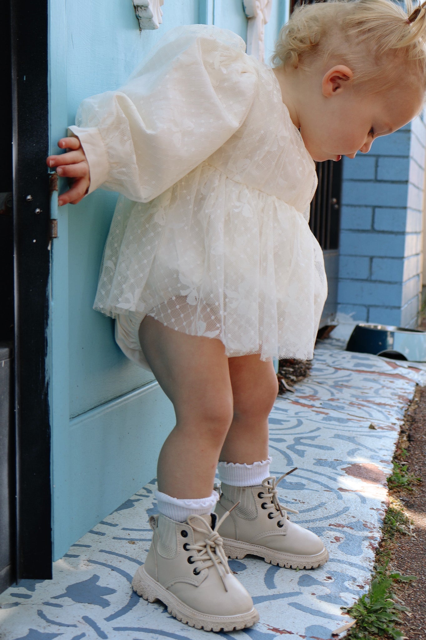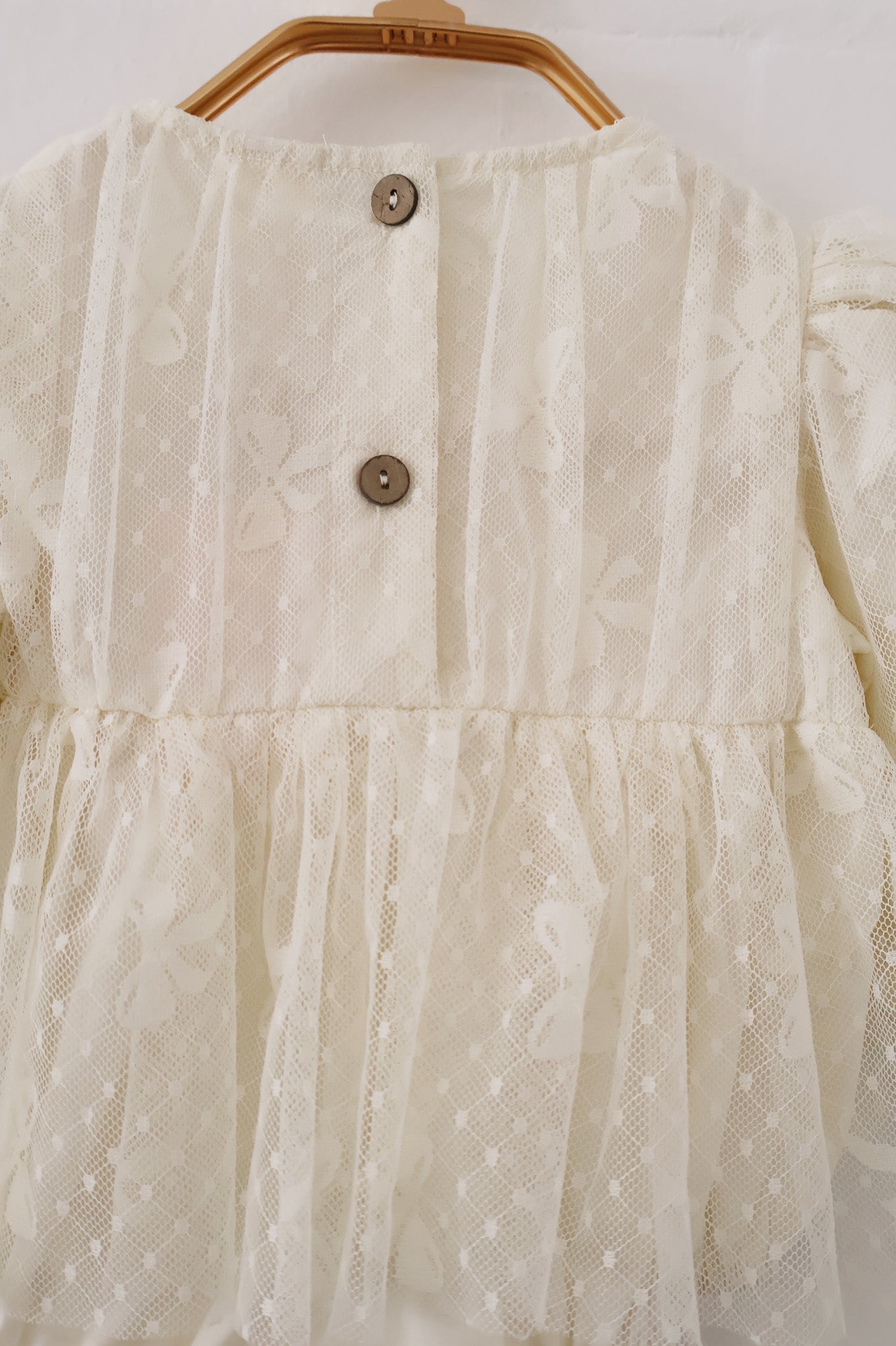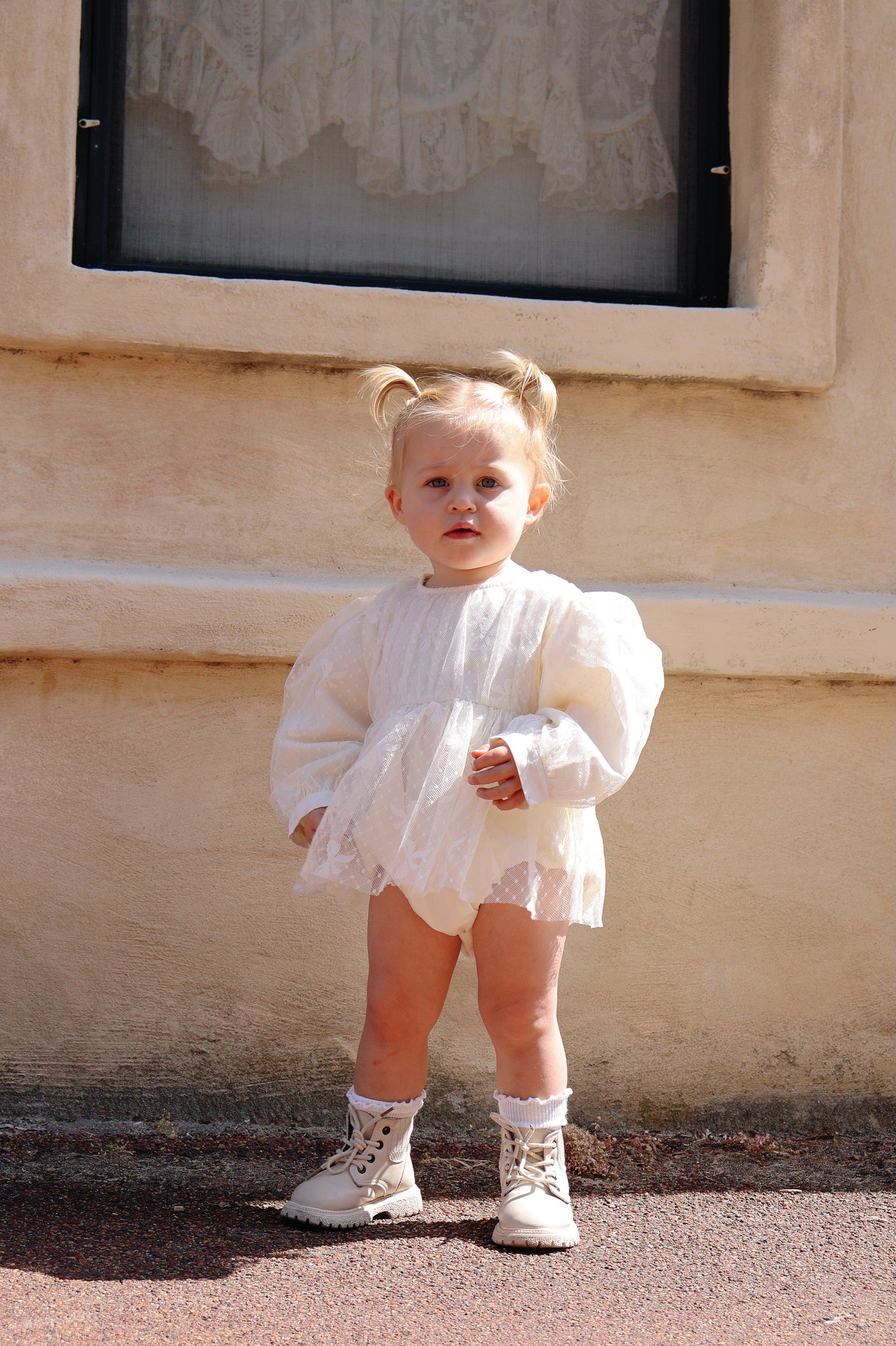 Delicate, dreamy, and effortlessly enchanting, the Tommi Romper is a vision of timeless beauty. Designed for little ones who deserve nothing less than magic, this long-sleeve romper is adorned with an intricate lace overlay, evoking an air of vintage romance.