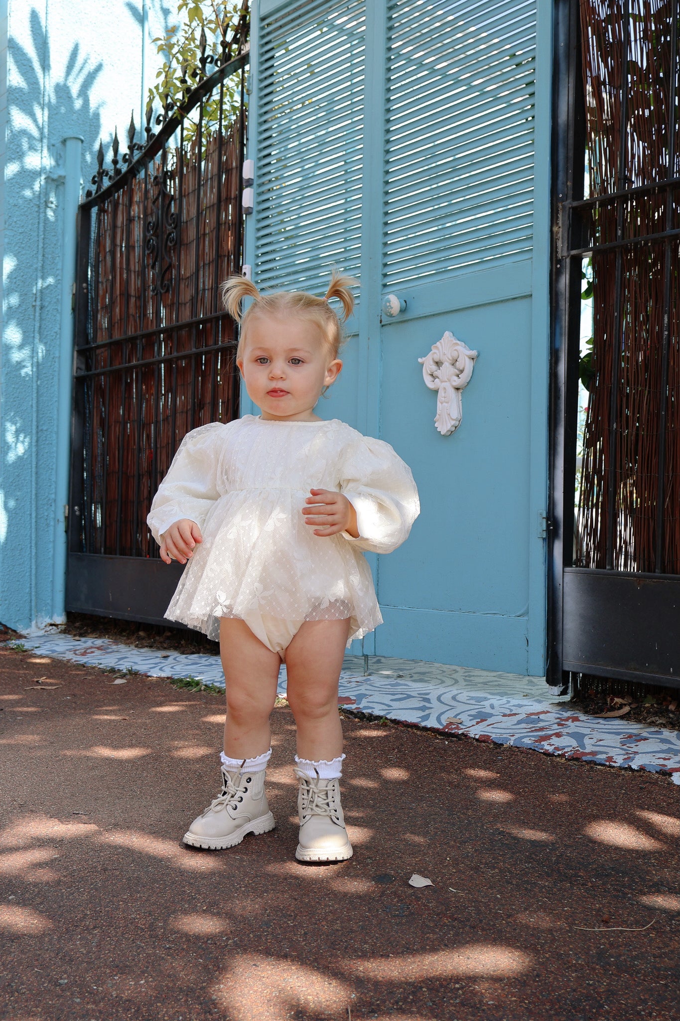 The soft, breathable fabric ensures comfort, while the thoughtfully designed snap crotch allows for ease and practicality. Whether it’s a christening, a first birthday, or a treasured family gathering, the Tommi Romper is the perfect choice for creating memories wrapped in elegance.