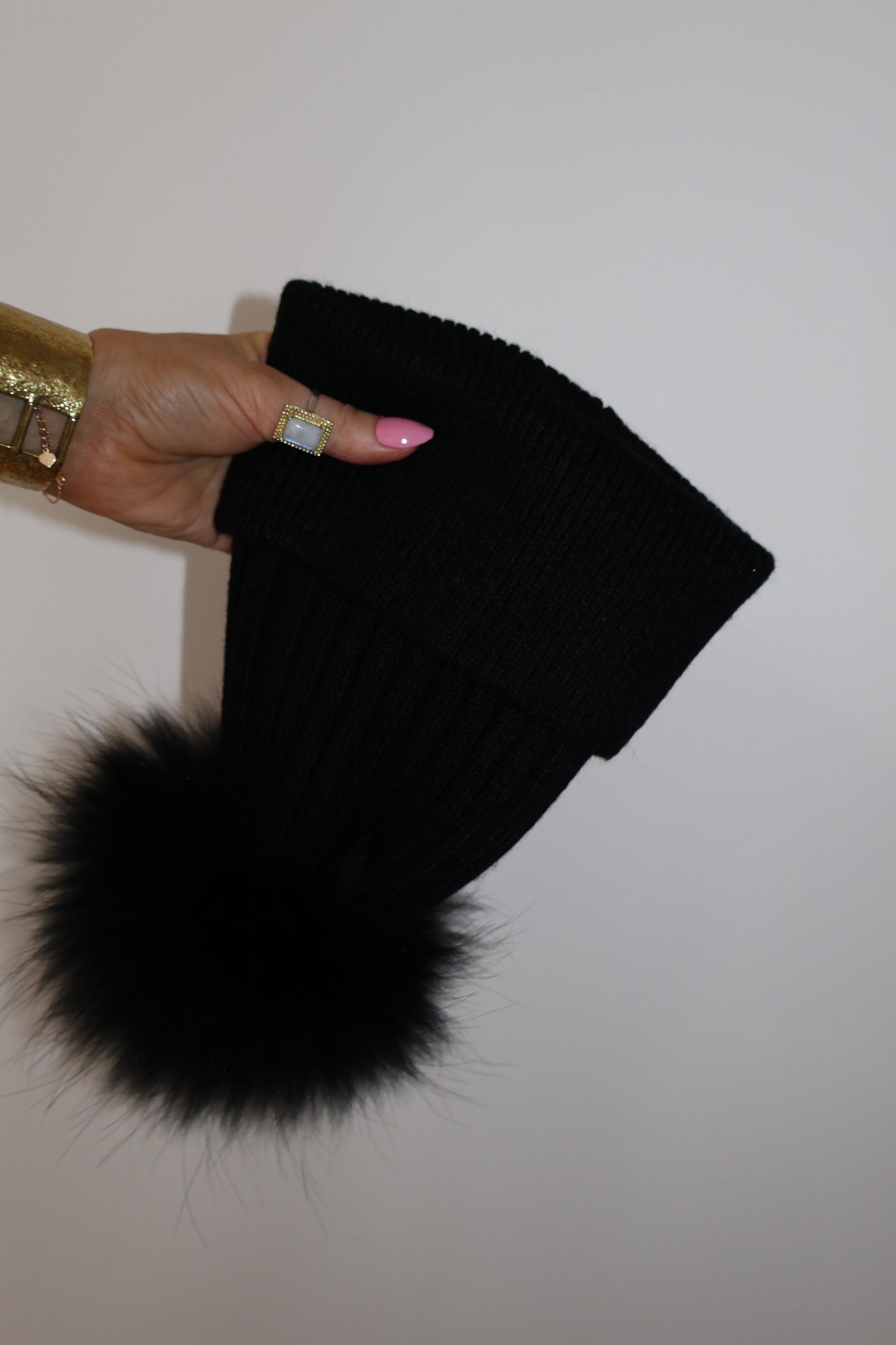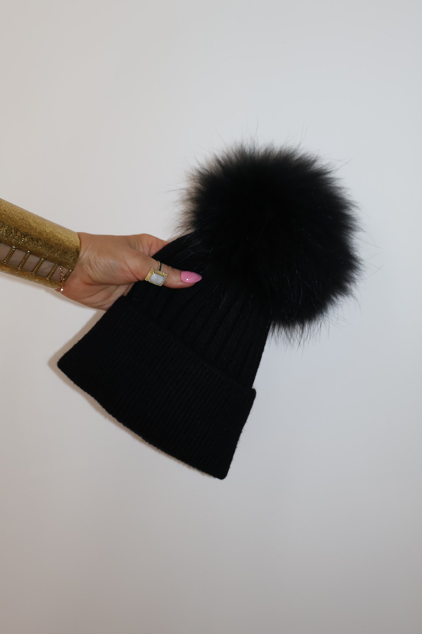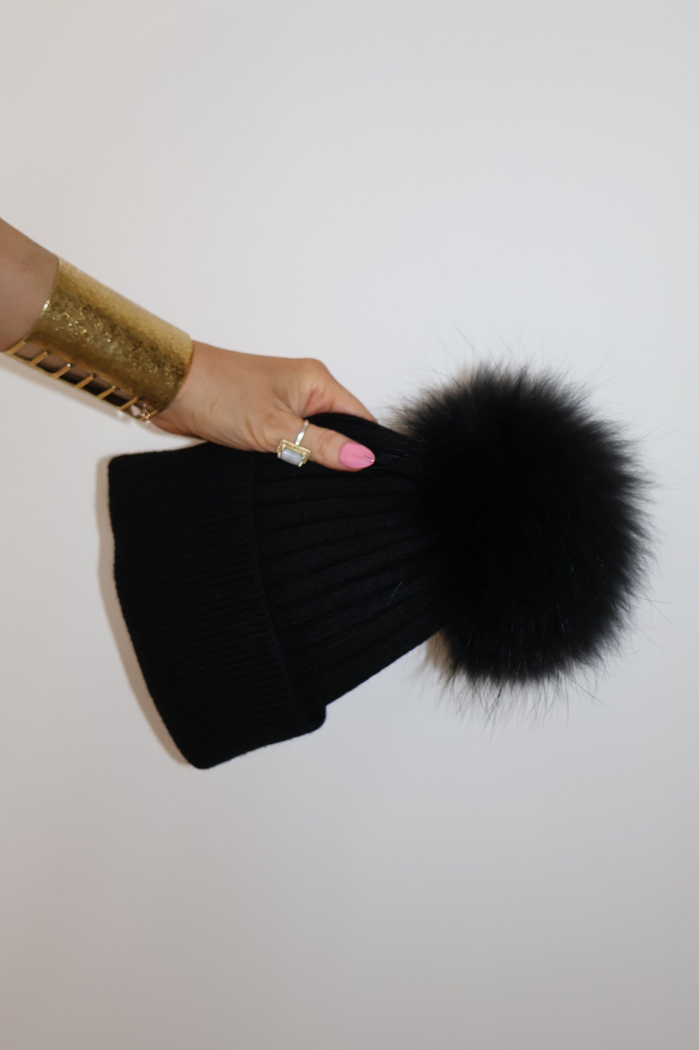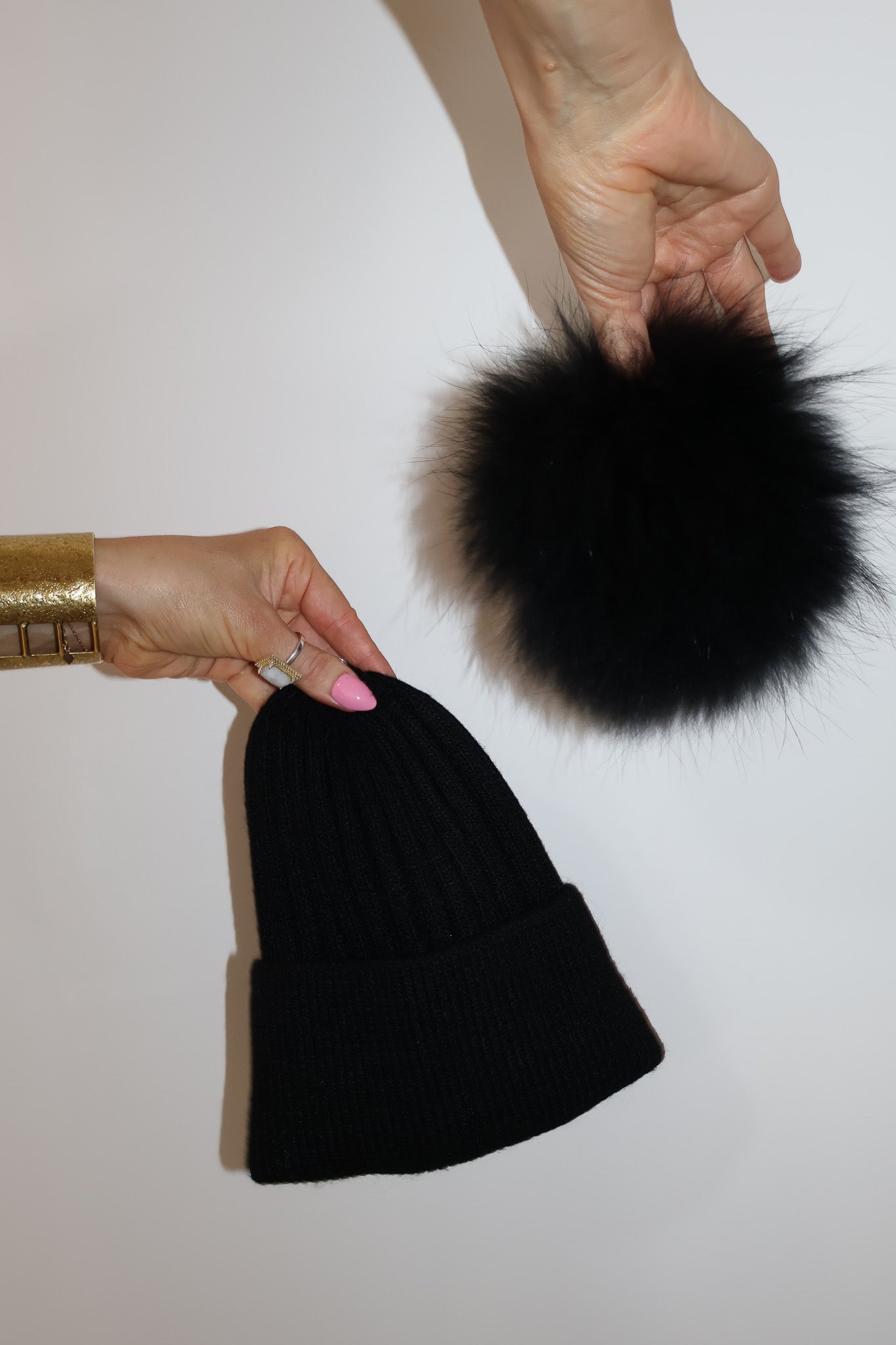 Detachable 100% racoon fur pom; press-stud attachment.