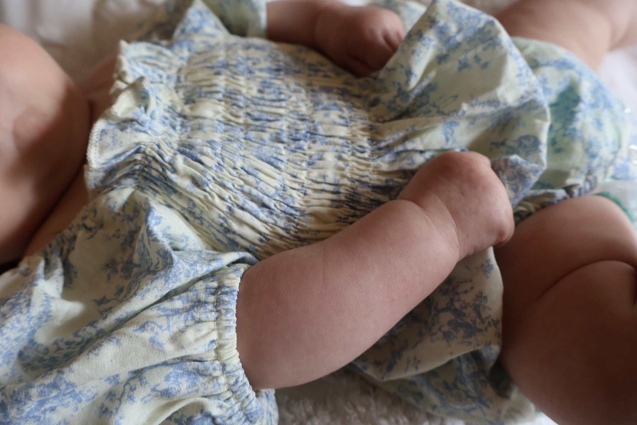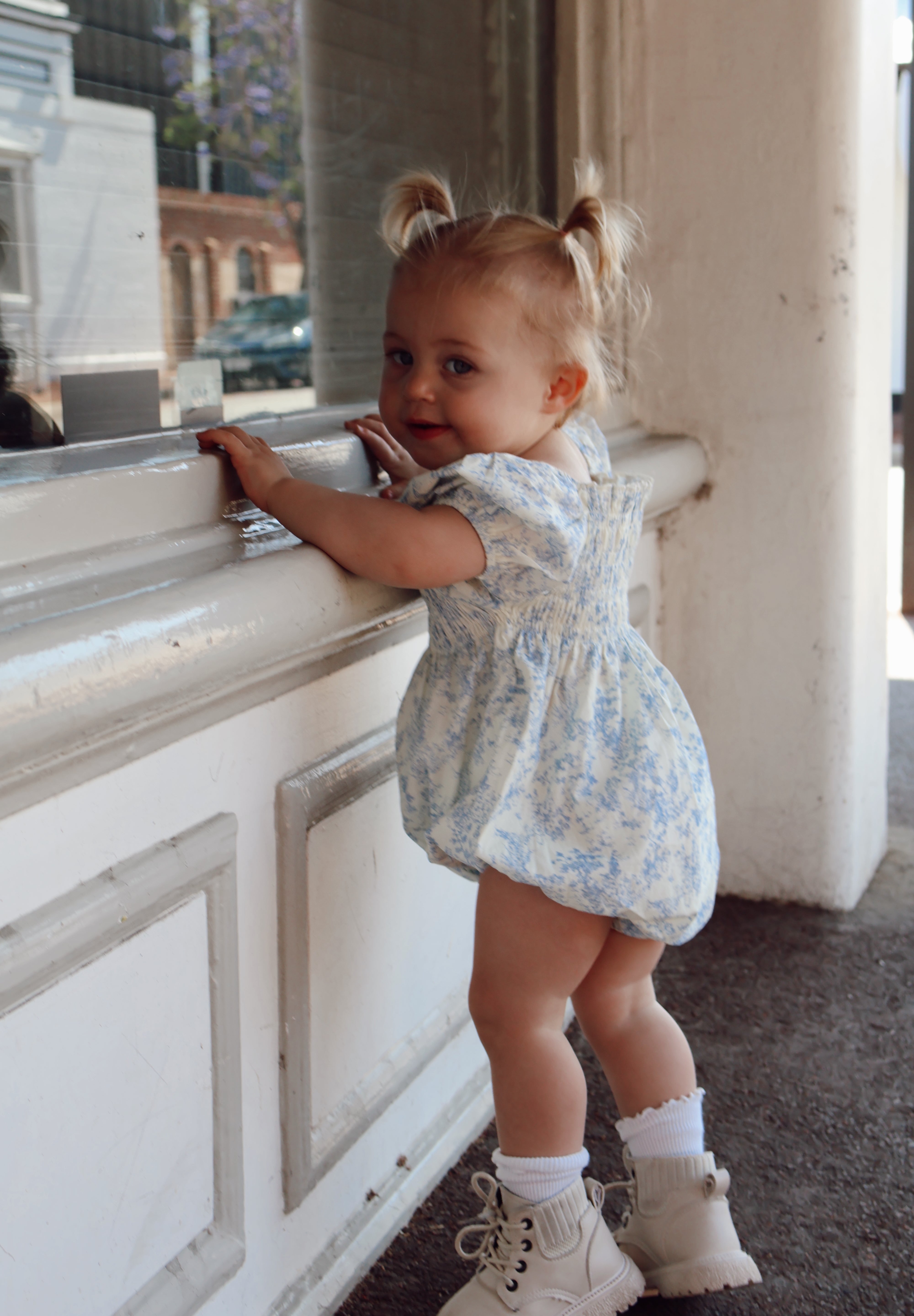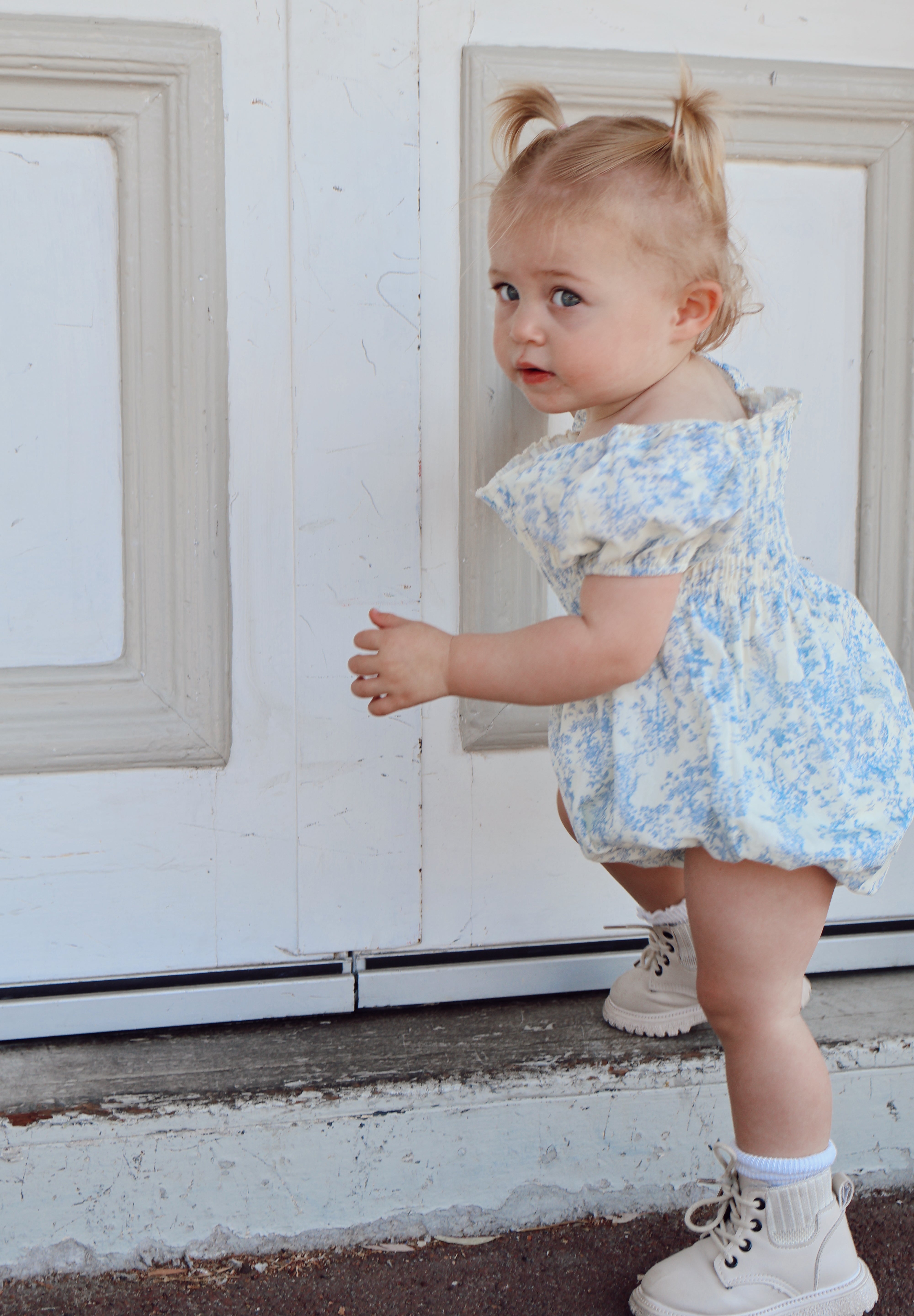 The Immi Baby Romper in Bluebell is an ideal choice for your newborn. The adorable romper features a delicate blue floral print and puff sleeves, accentuated with elasticated shirring on the bodice. Give your little one a romantic touch with this charming and comfortable romper.