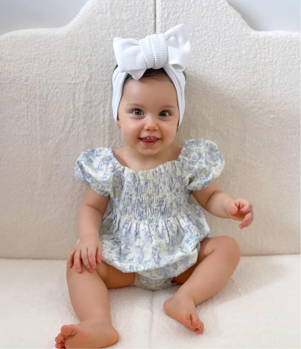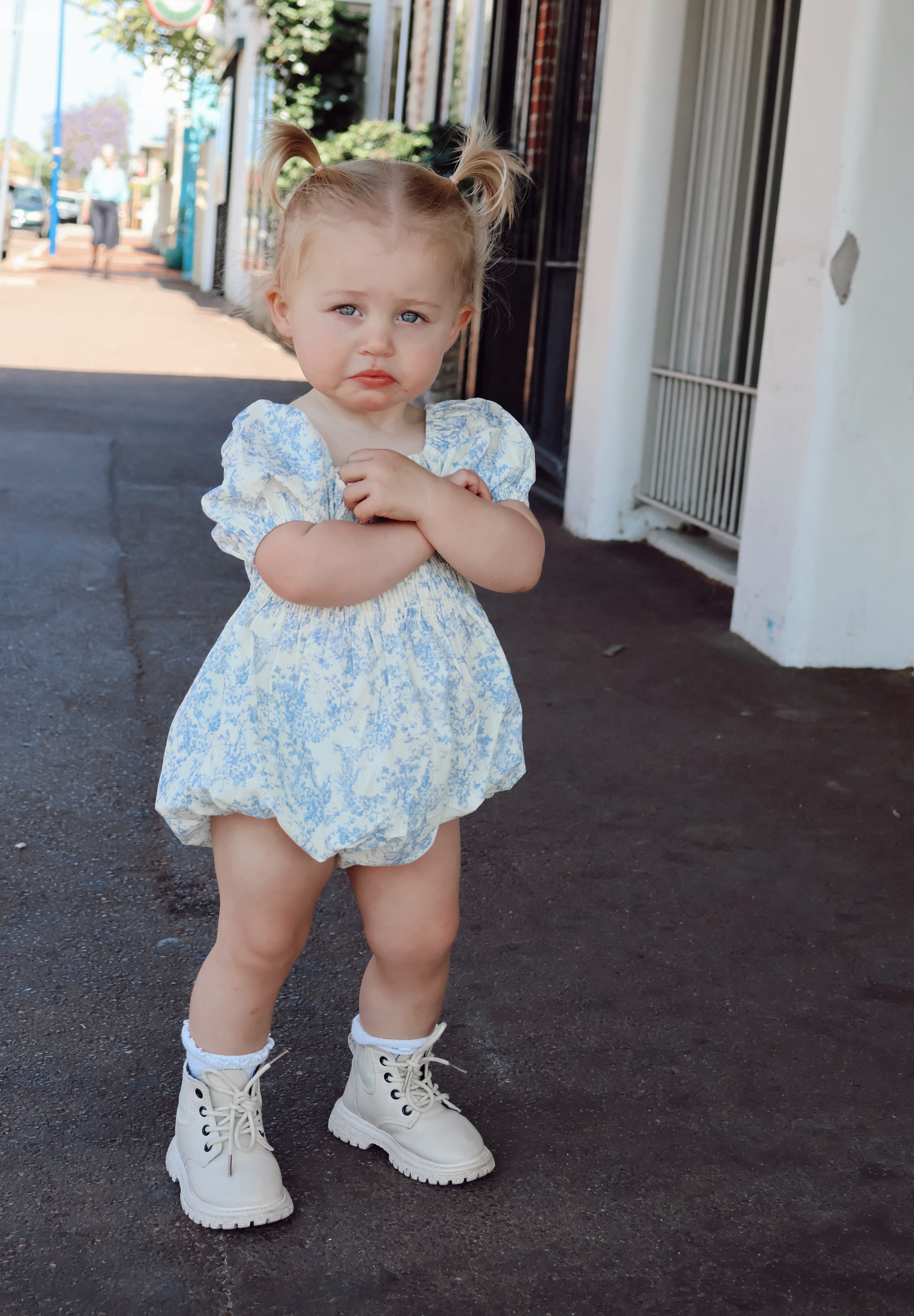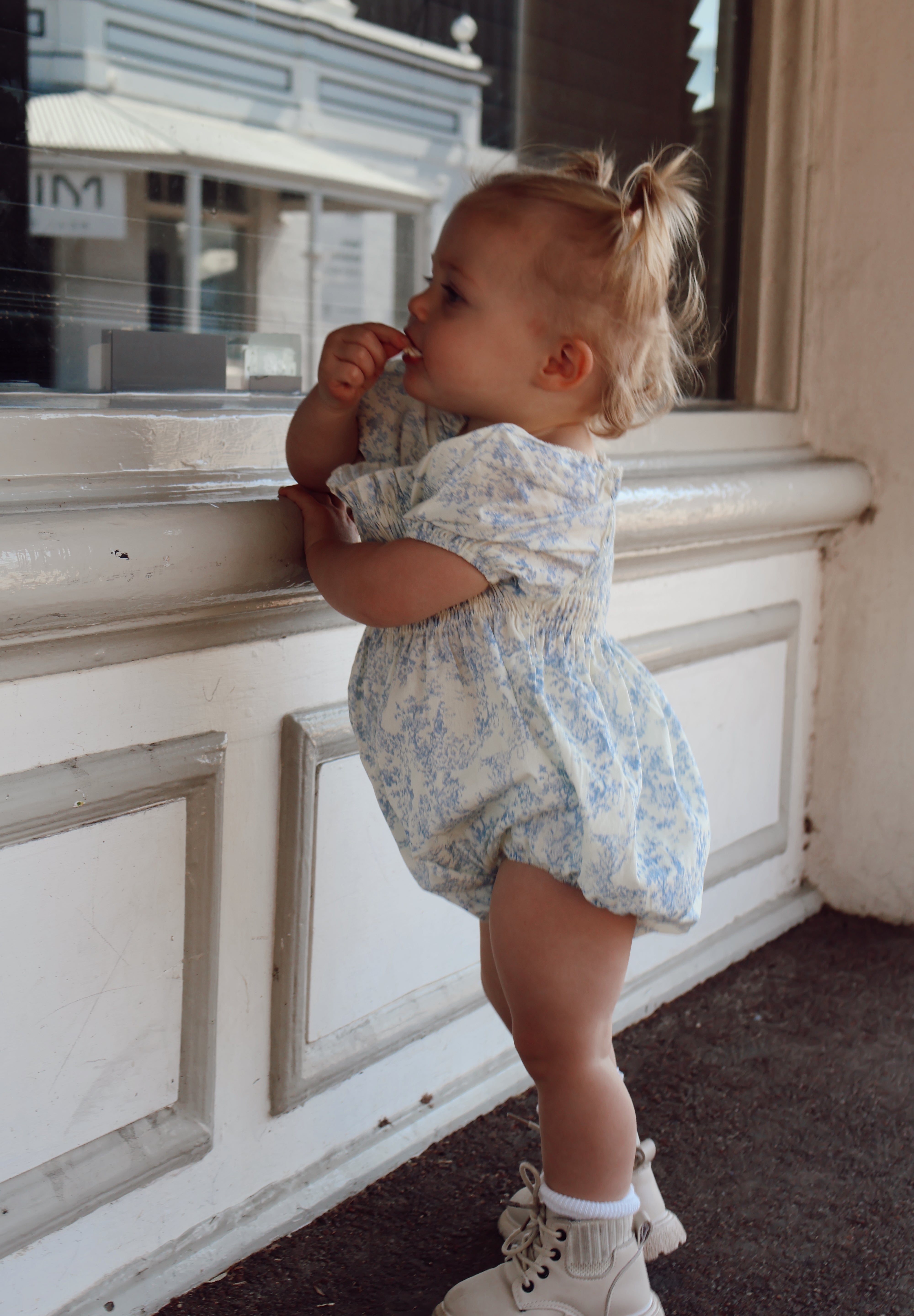 The Immi Baby Romper in Bluebell is an ideal choice for your newborn. The adorable romper features a delicate blue floral print and puff sleeves, accentuated with elasticated shirring on the bodice. Give your little one a romantic touch with this charming and comfortable romper.