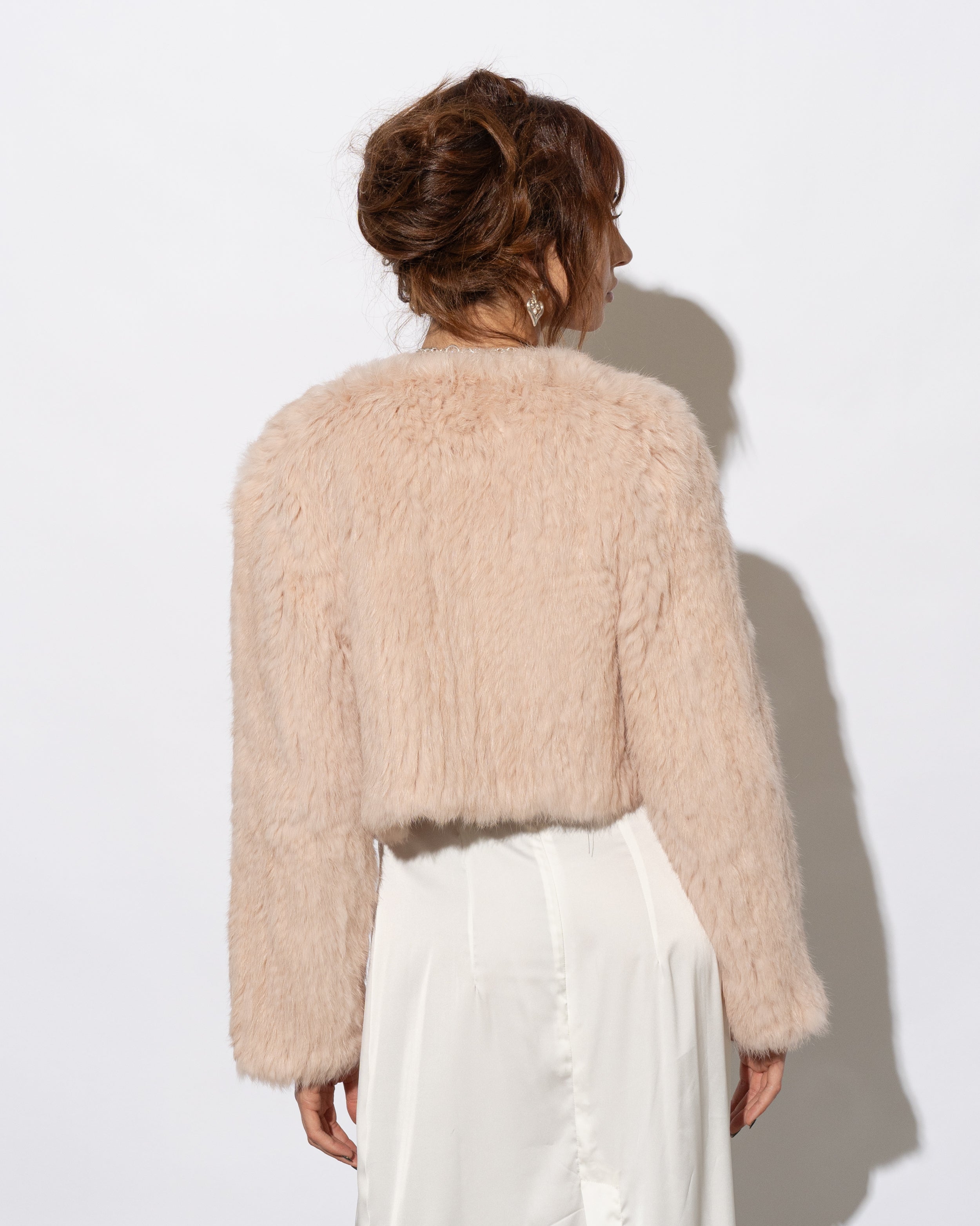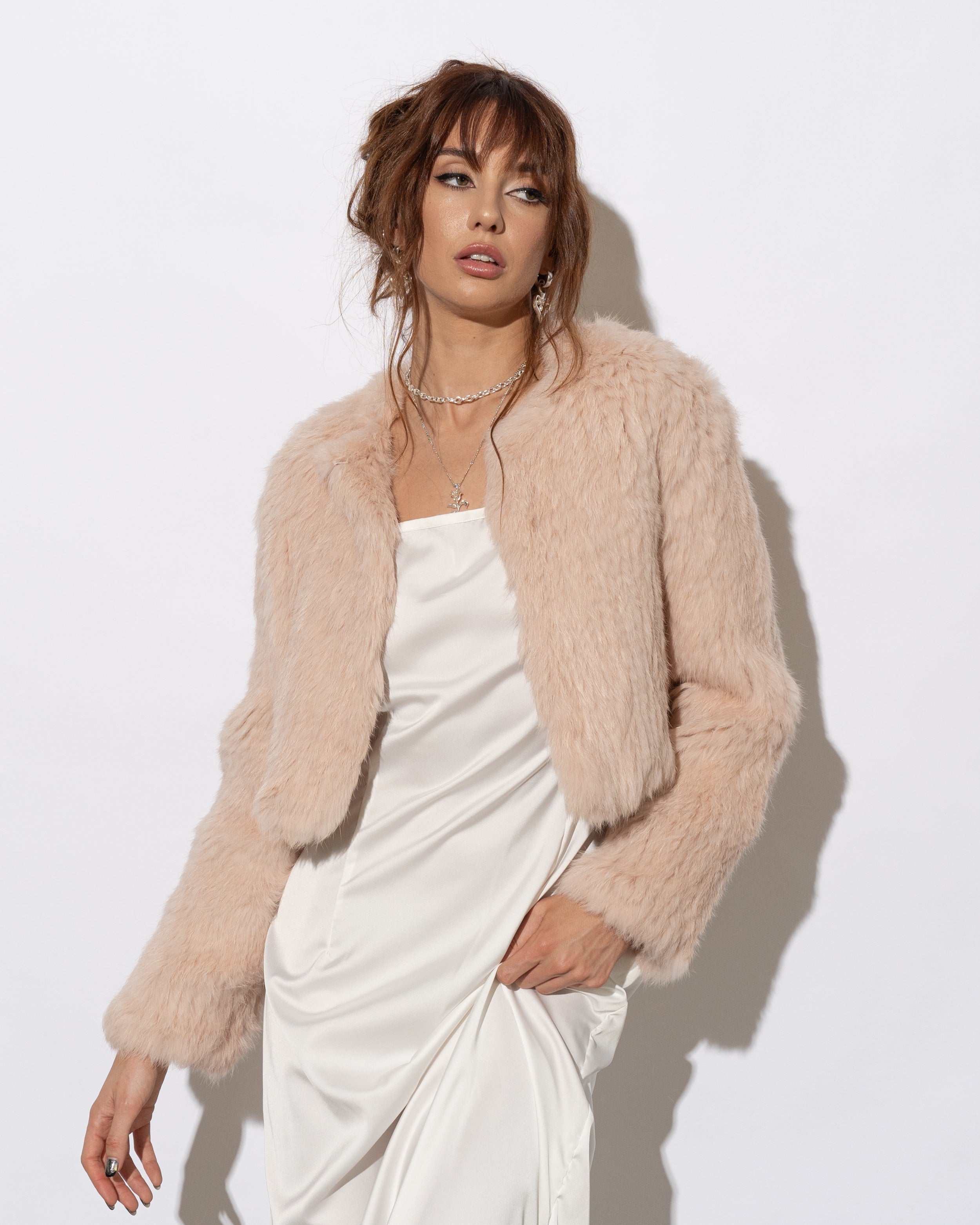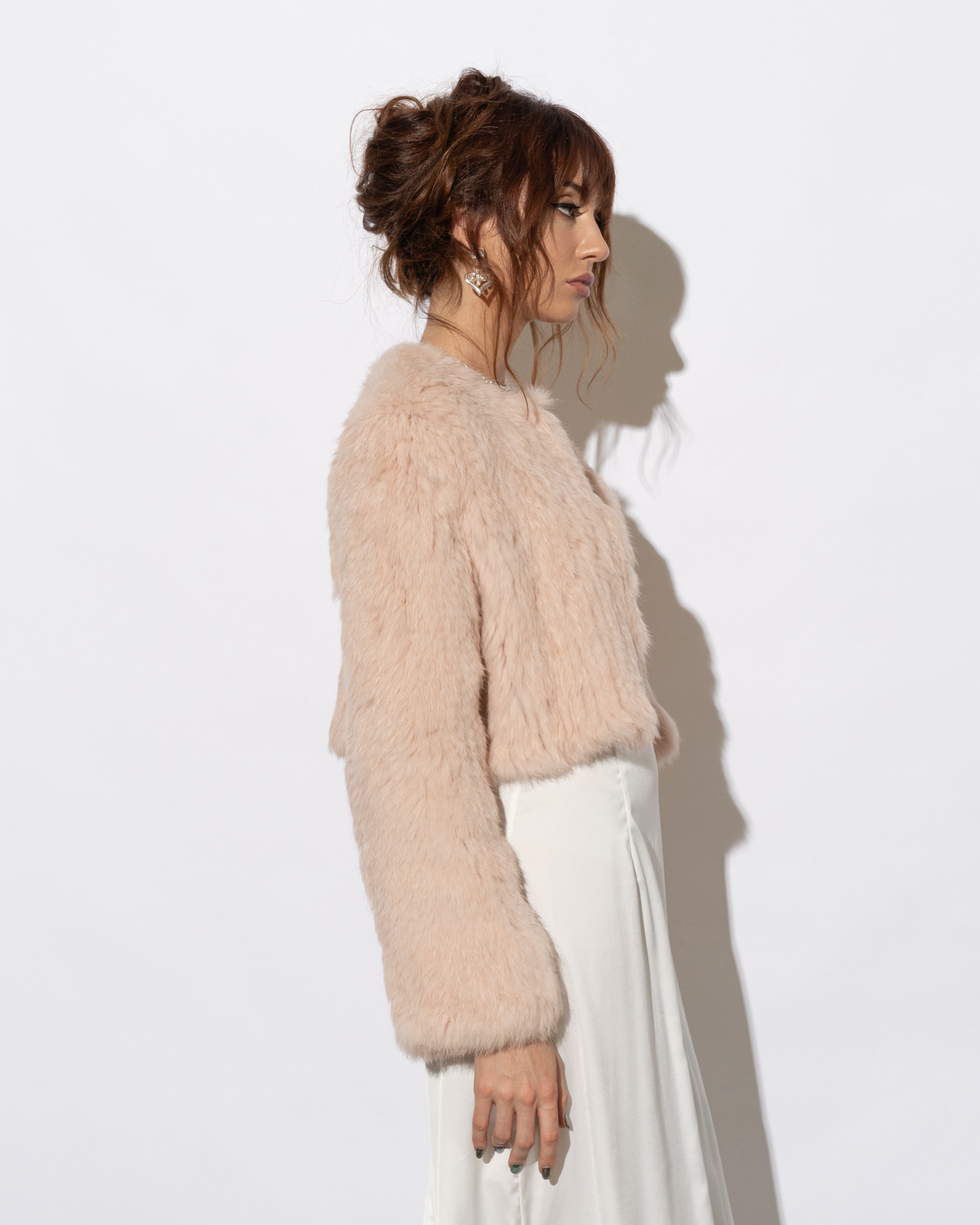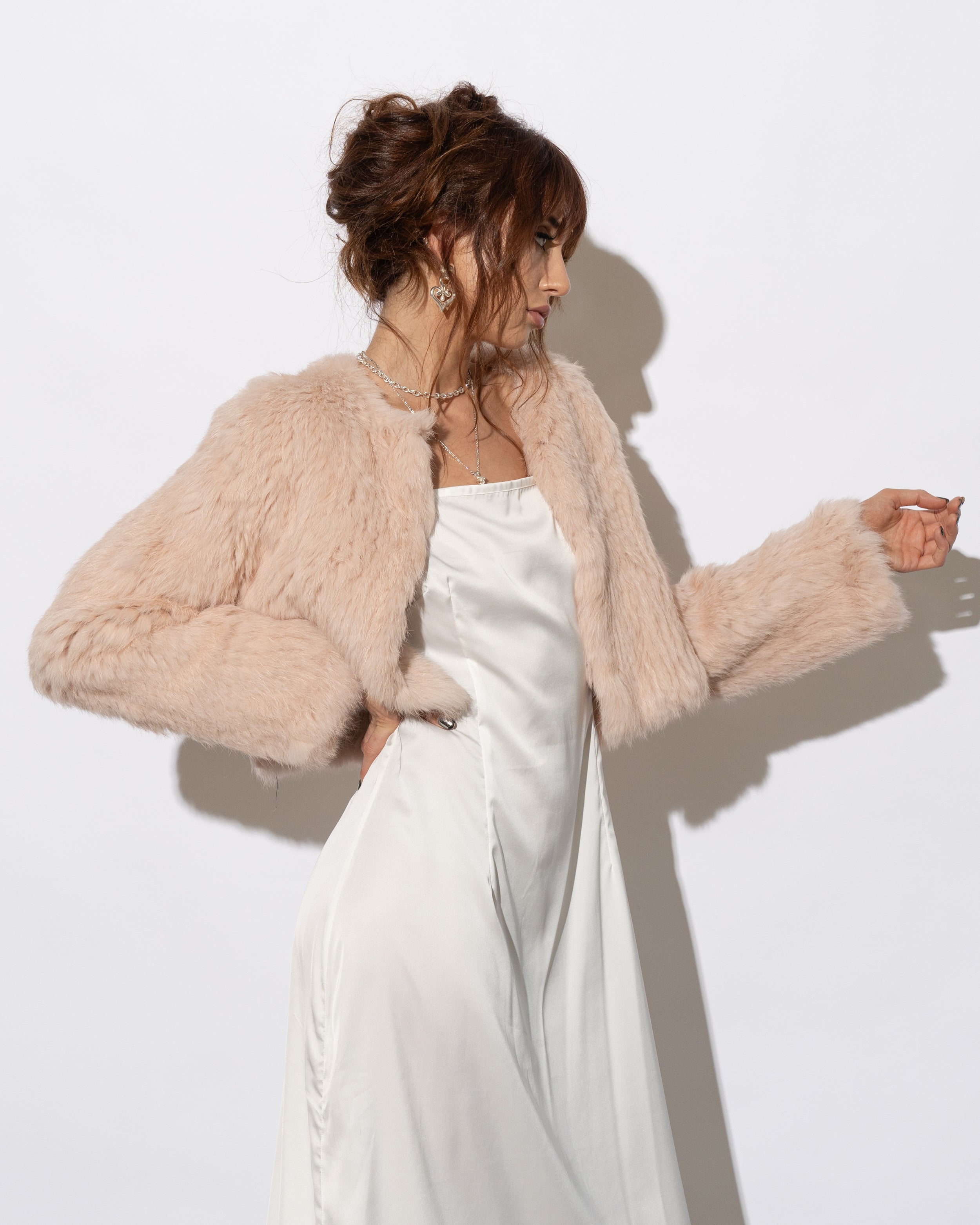 The Laci Long Sleeve Fur Jacket is ideal for brides who are seeking additional coverage on their wedding day. The cropped jacket style is available in either ¾ length of full length sleeves and the body of the jacket is shorter in length so it is designed to complement bridal gown, without compromising any shape or detail. This jacket is made from knitted rabbit fur and is lined with fur on the inside making it incredibly warm and luxurious.