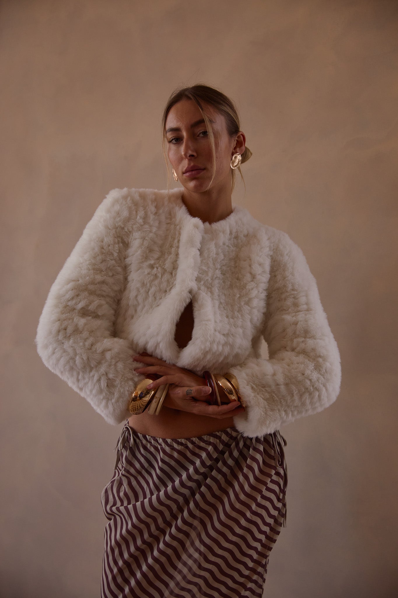 The gorgeous Macie Faux Fur long sleeve jacket exudes sophisticated elegance. While providing warmth and coverage with its velvety soft texture, its cropped length is designed to compliment that special outfit without compromising shape or detail.