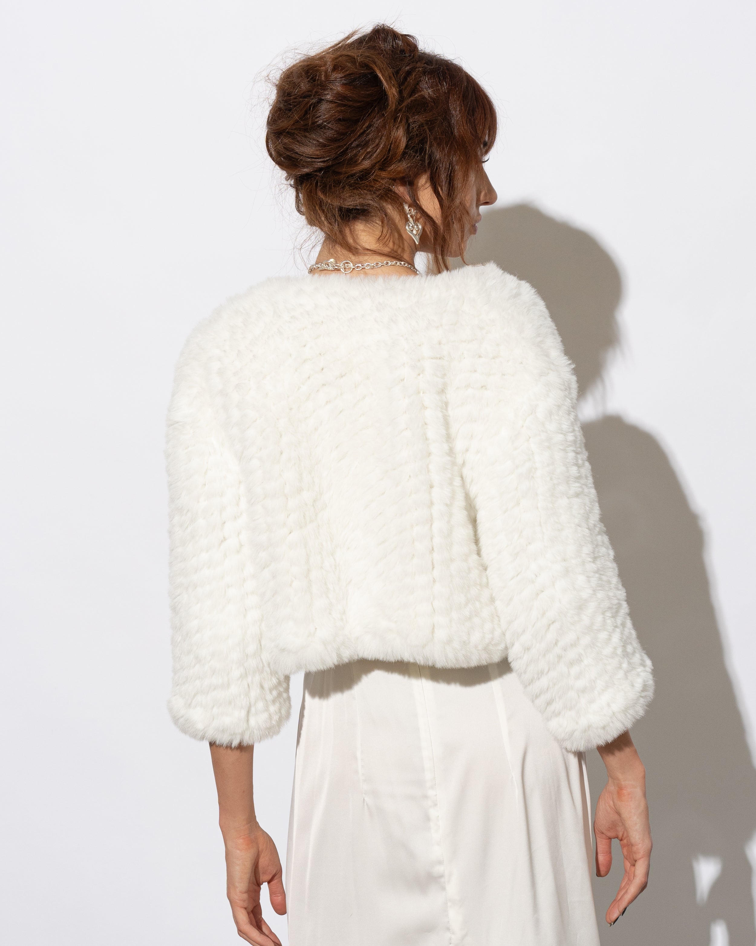 Made from hand-knitted faux rex rabbit fur; offering an exquisite velvety texture.