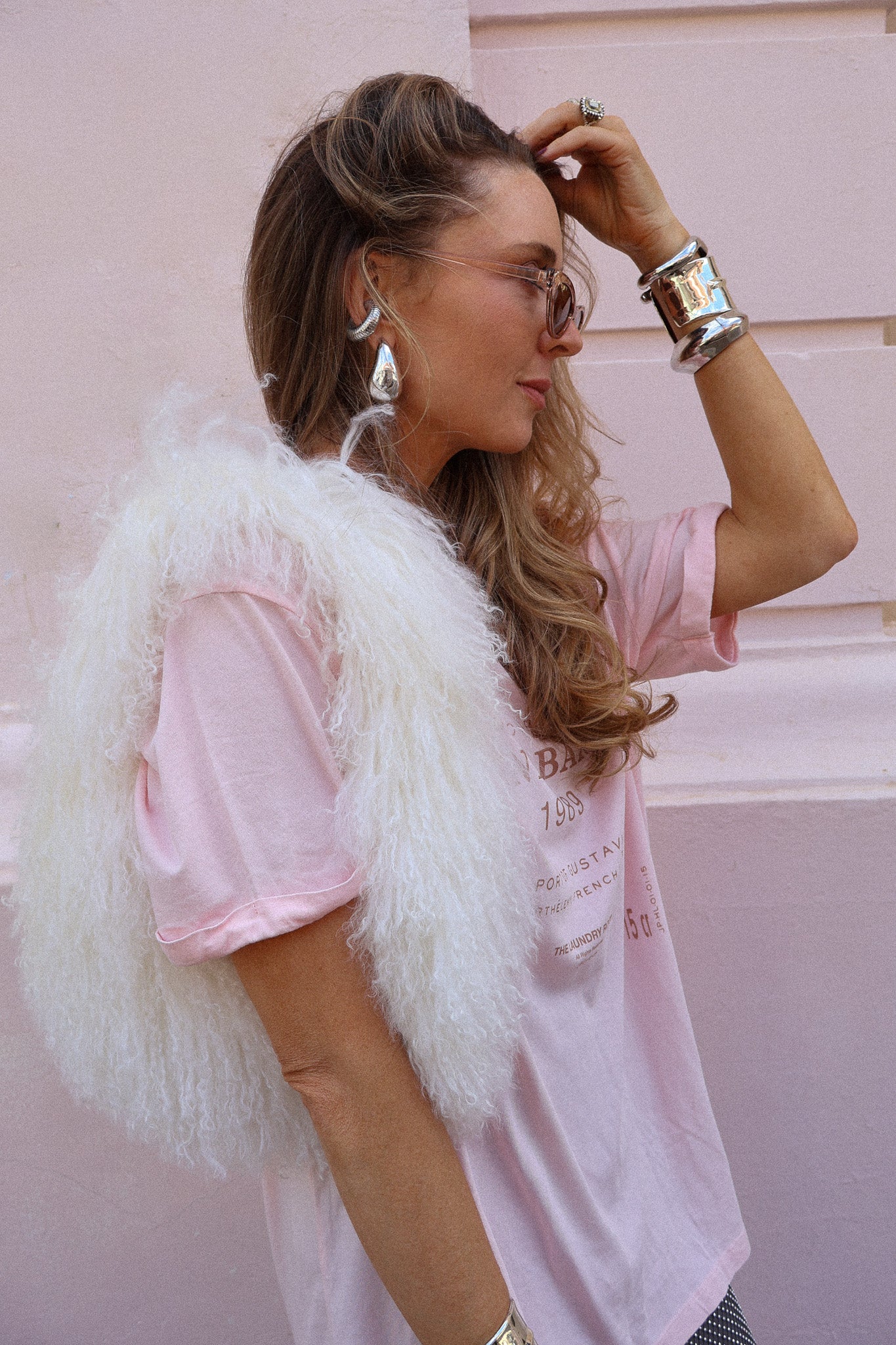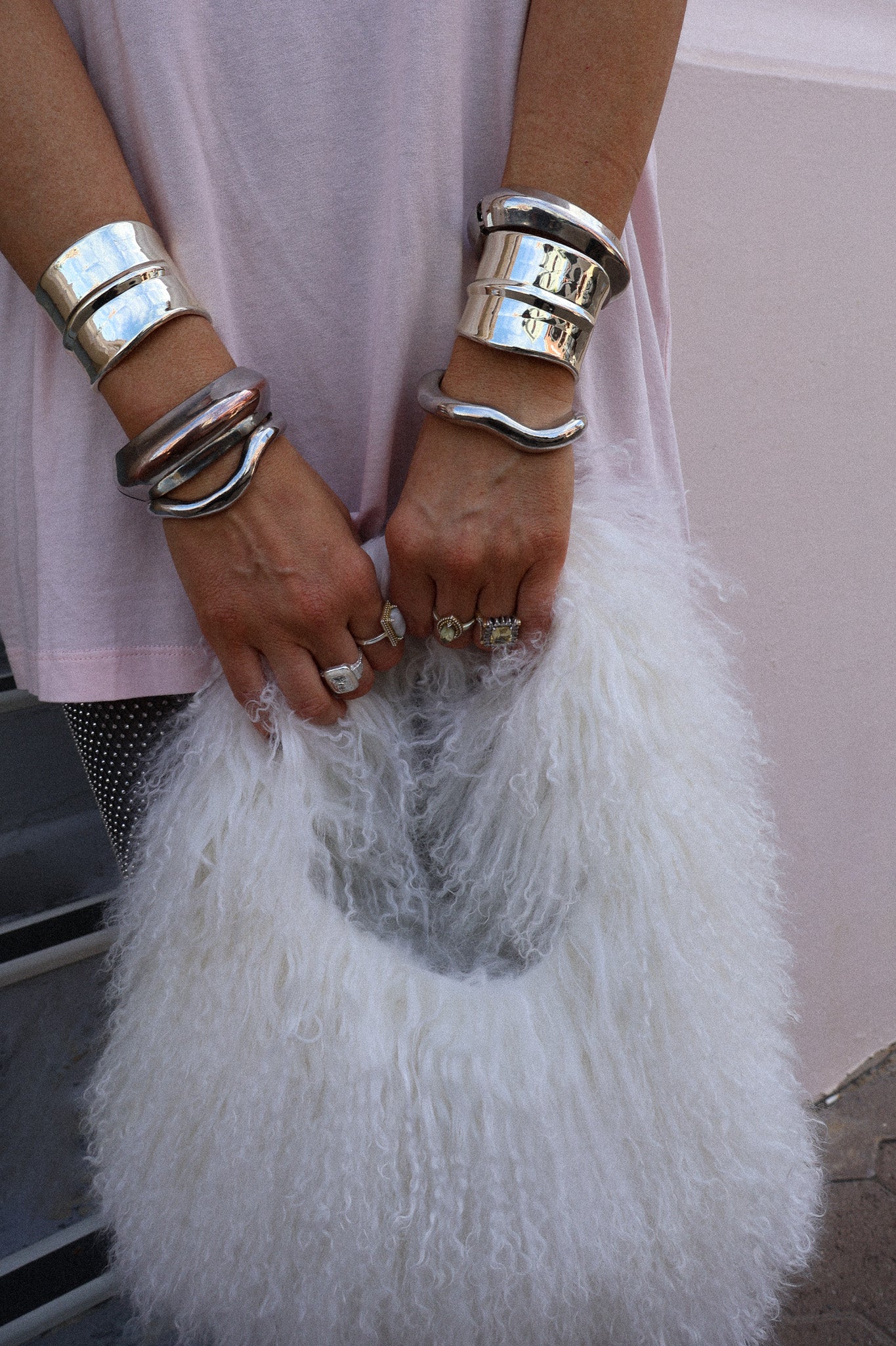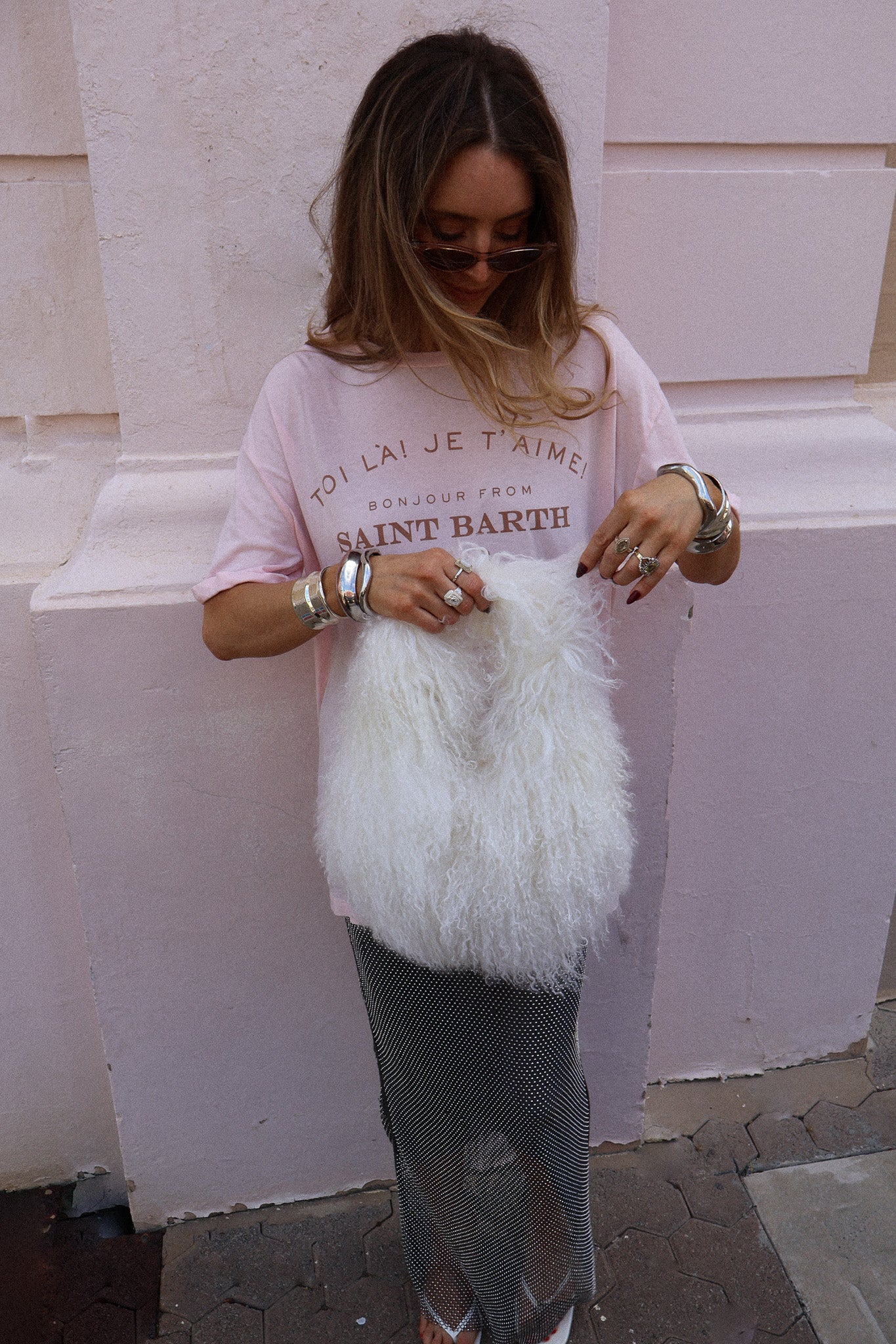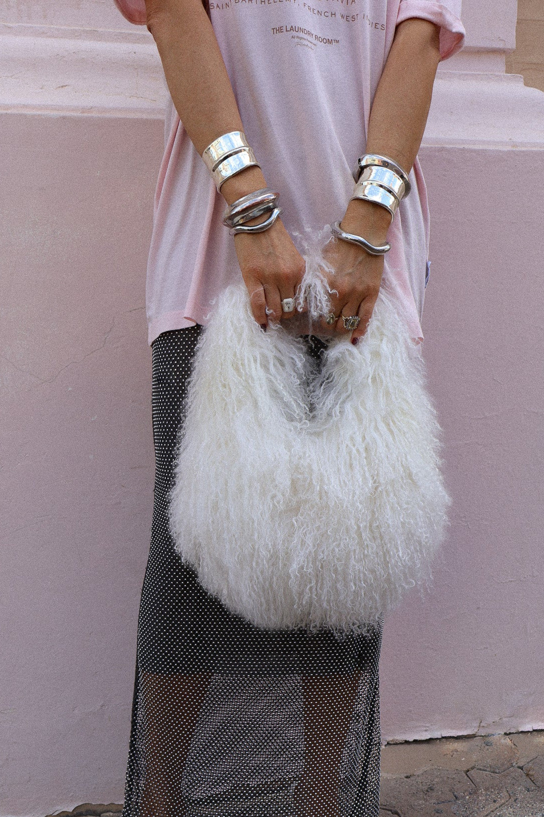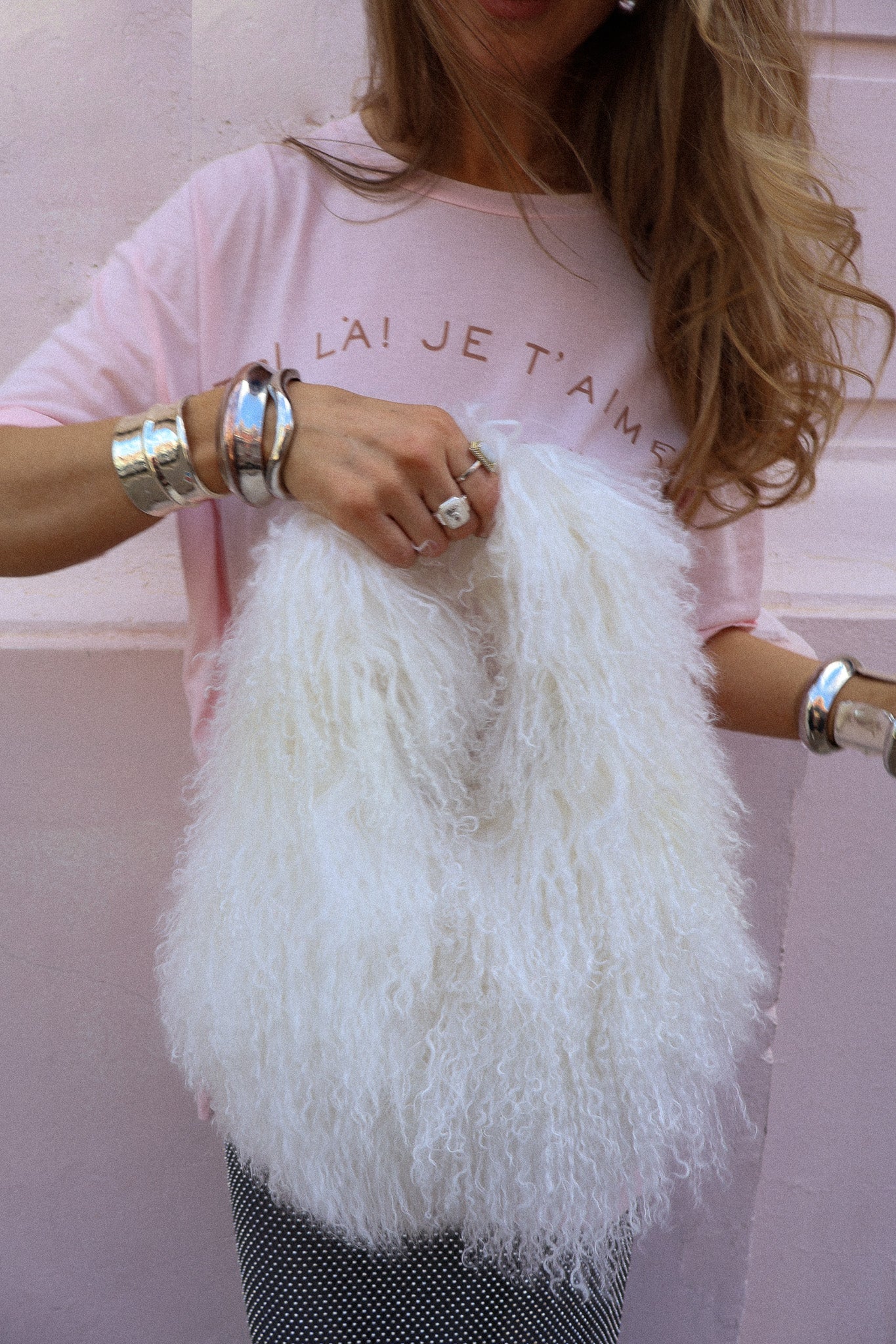 The Manhattan Bag in Cloud Dancer is winter magic in accessory form. Crafted from cloud-soft Mongolian fur, this fluffy tote bag delivers that signature M&A texture. Plush, touchable, and beautifully dramatic.