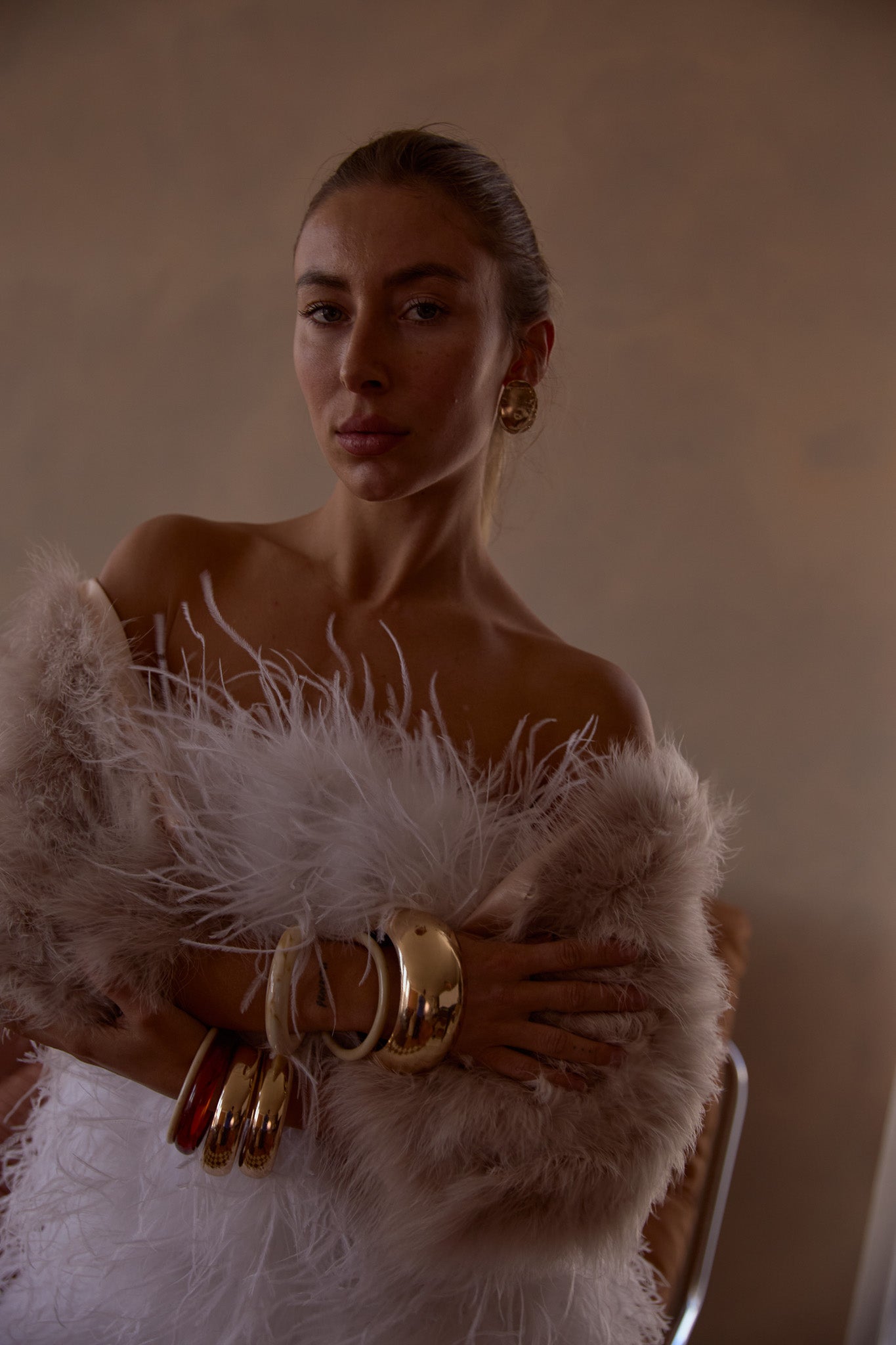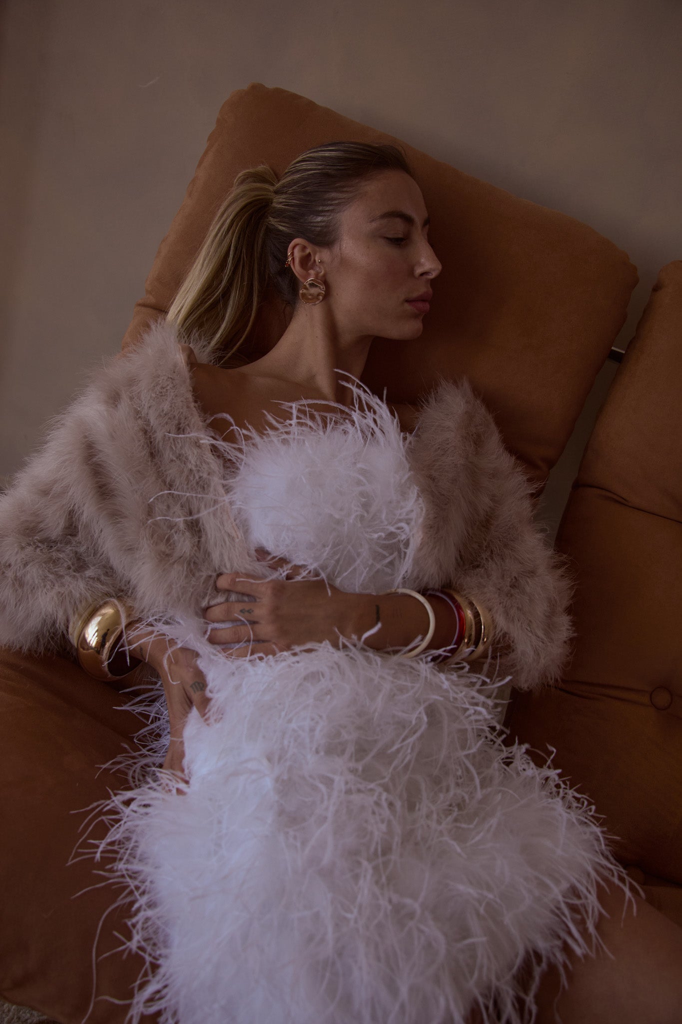 This stunning Plume Real Feather Jacket is the ultimate lightweight jacket, with its cropped jacket style and the ¾ length sleeves are designed to complement any gown or outfit, without compromising on shape or detail.