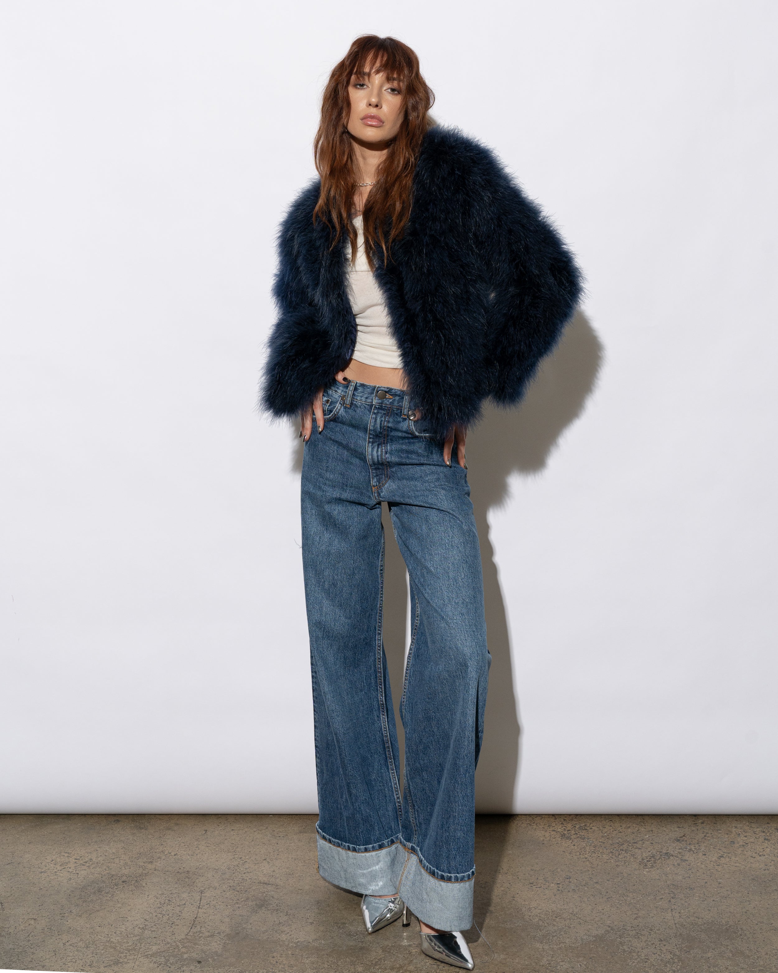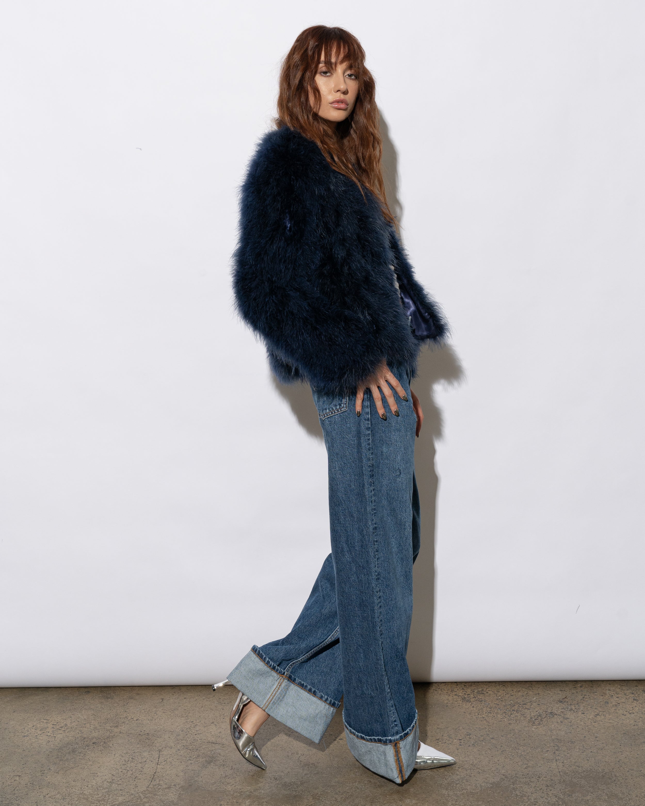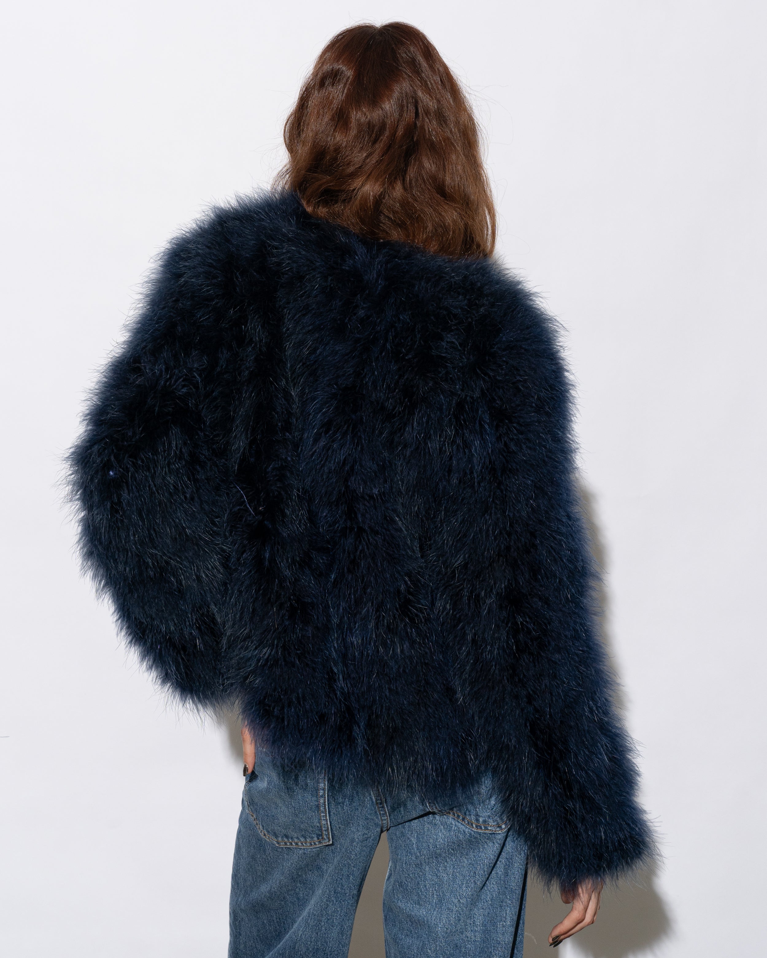 The Saville jacket is made from 100% marabou feather with satin lining.