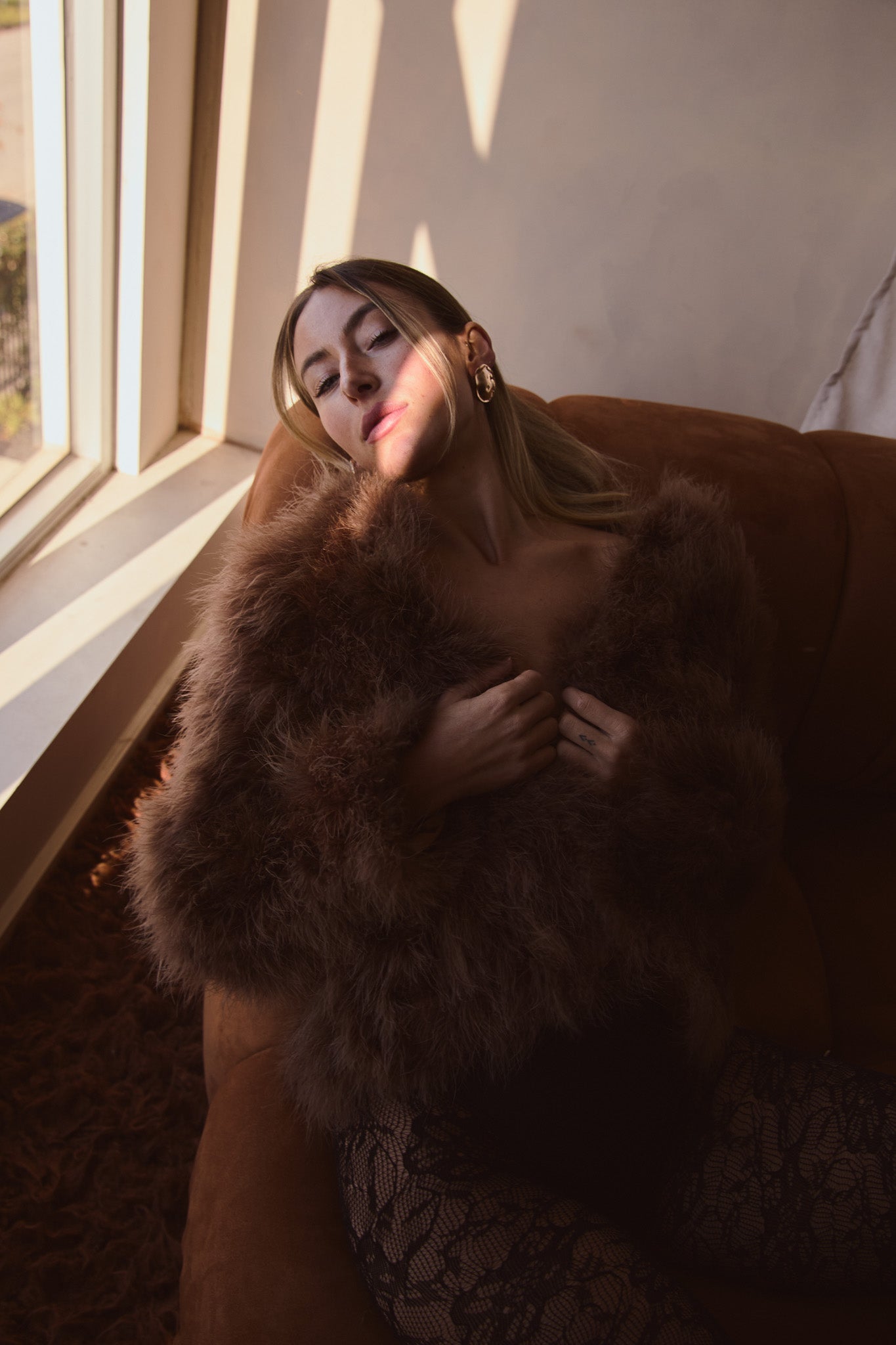 The Saville jacket is made from 100% marabou feather with satin lining.