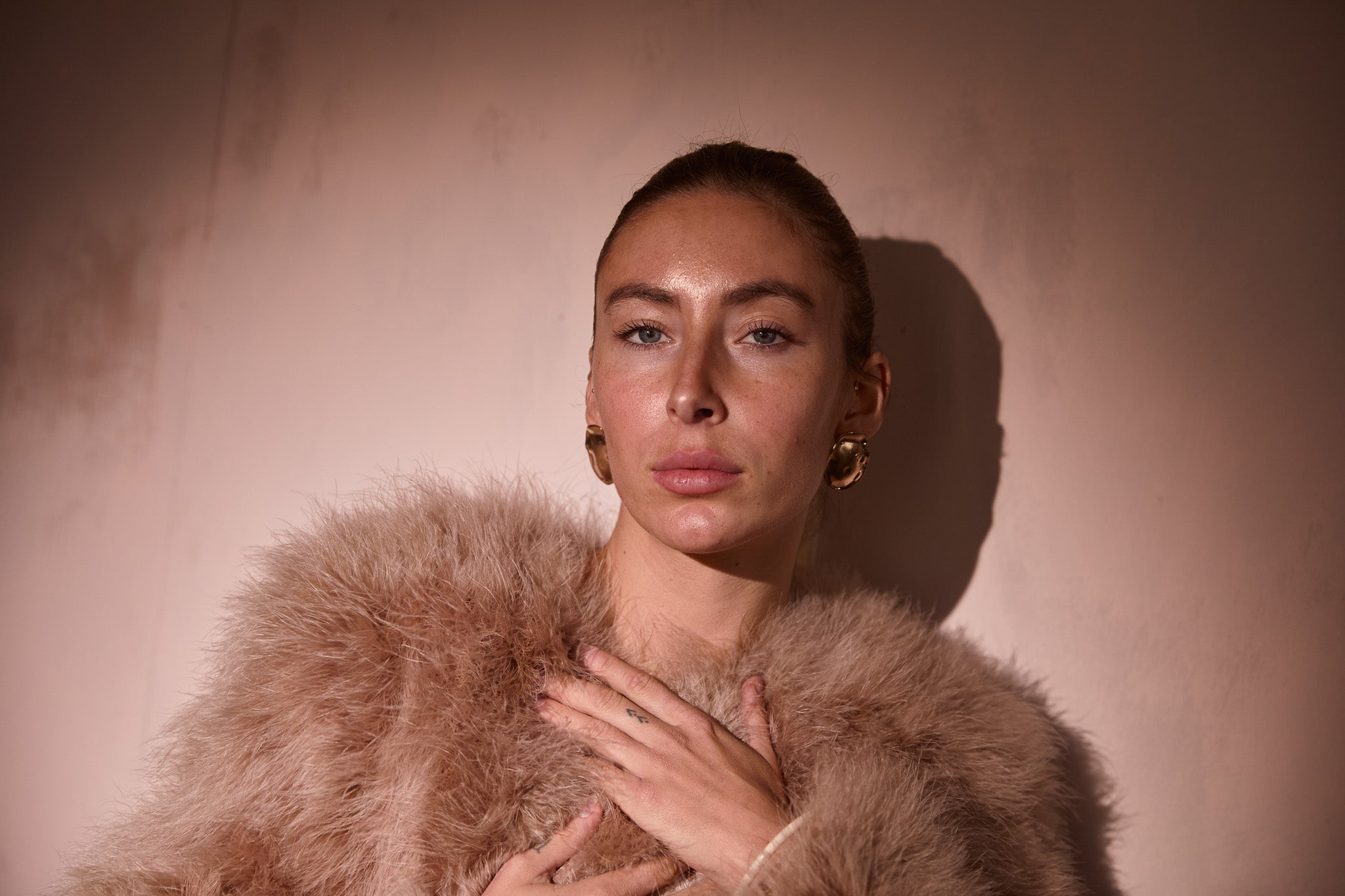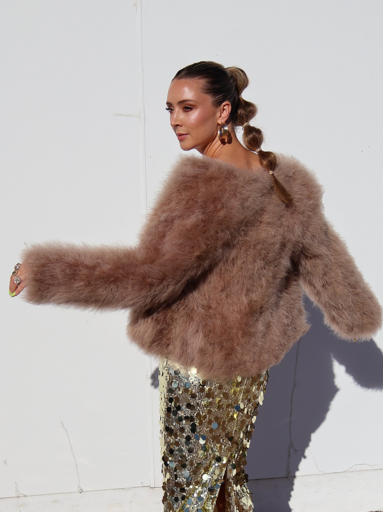 The Saville jacket is made from 100% marabou feather with satin lining.