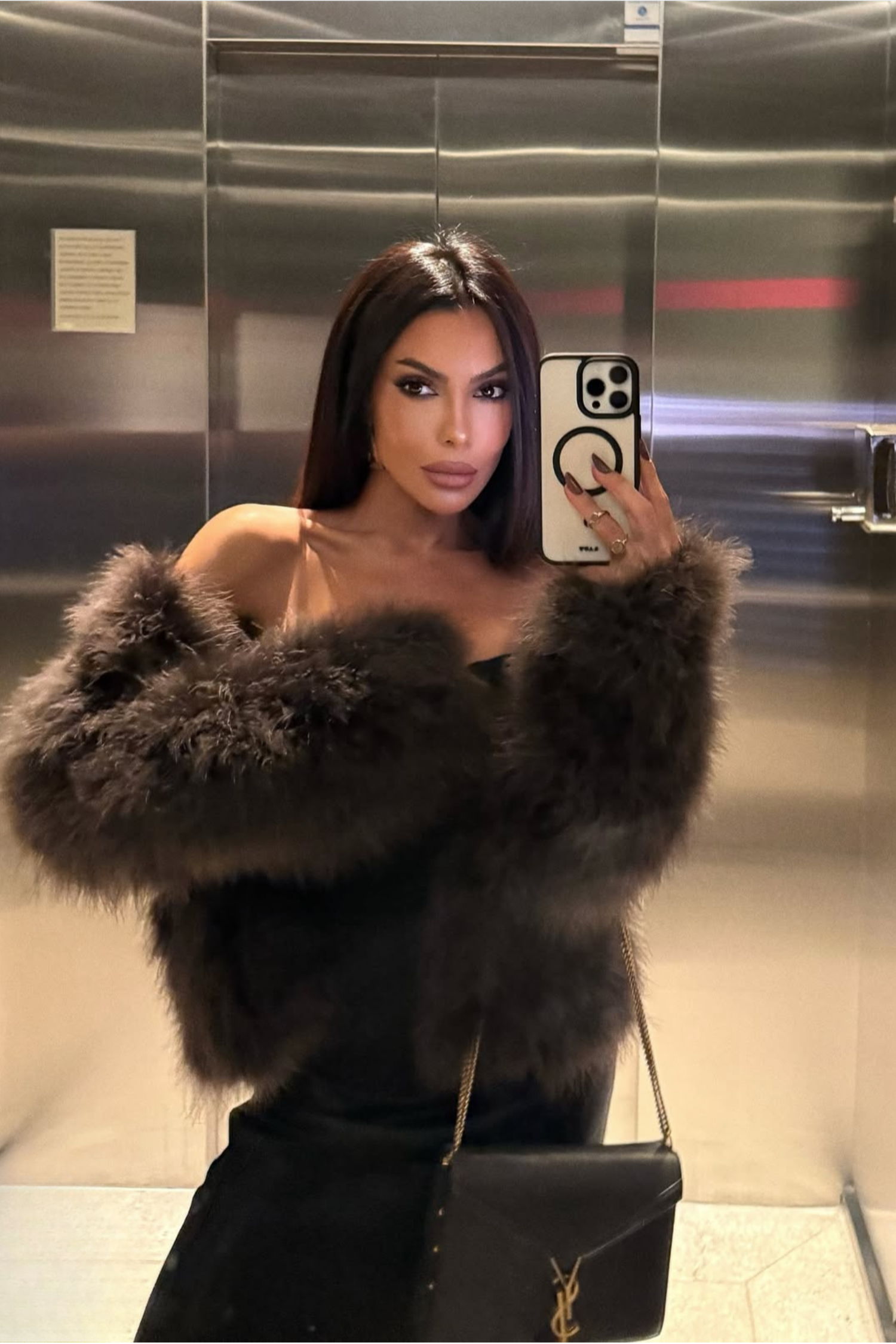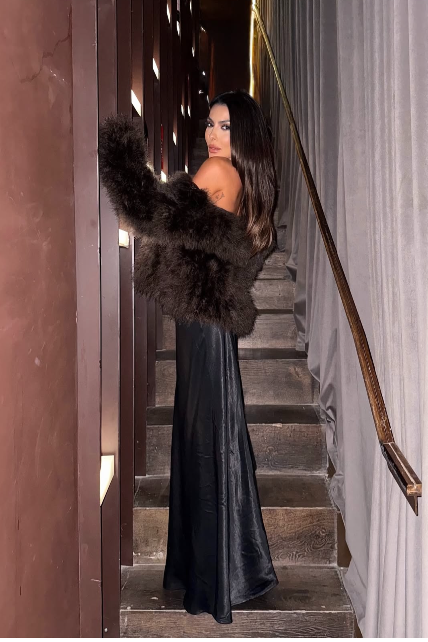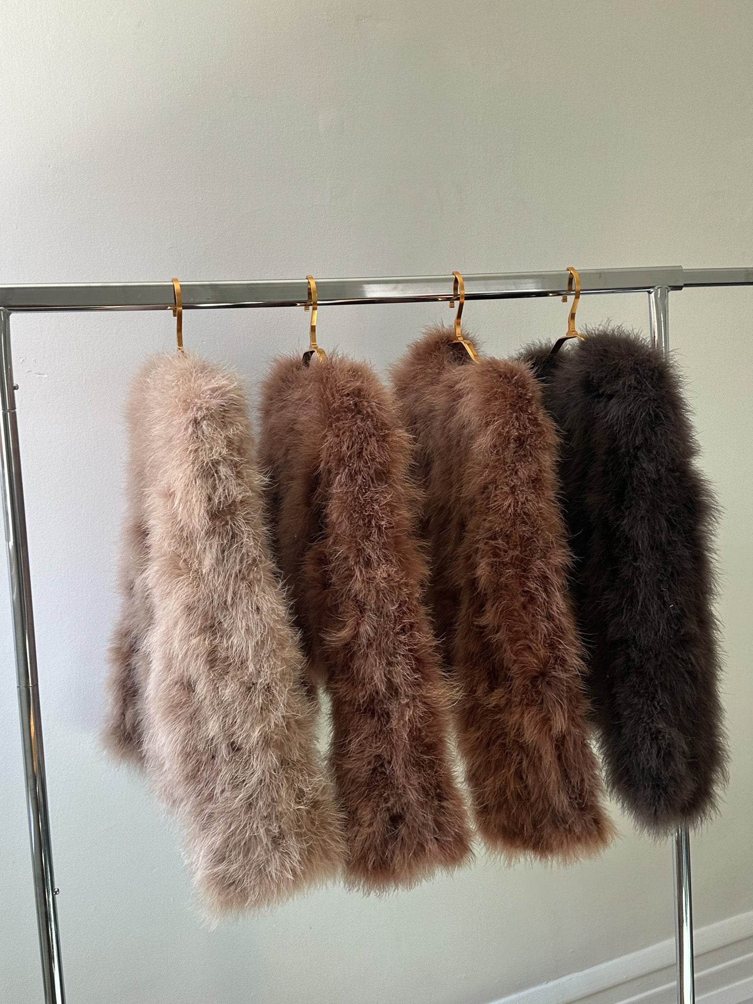 The Saville jacket is made from 100% marabou feather with satin lining.