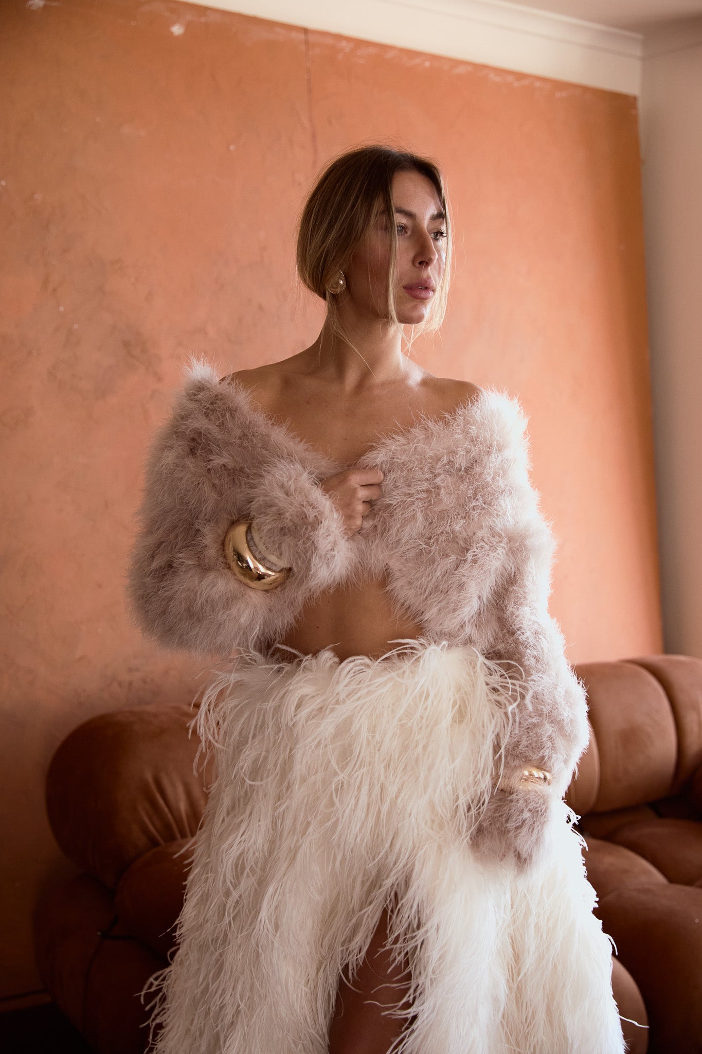 Begin a love affaire with the richly feminine and undeniably romantic Valentina Feather Jacket in Blush. The delicate marabou feathers create playful movement guaranteed to garner attention, whether you’re the guest of honour, maid of honour or mother of the bride.