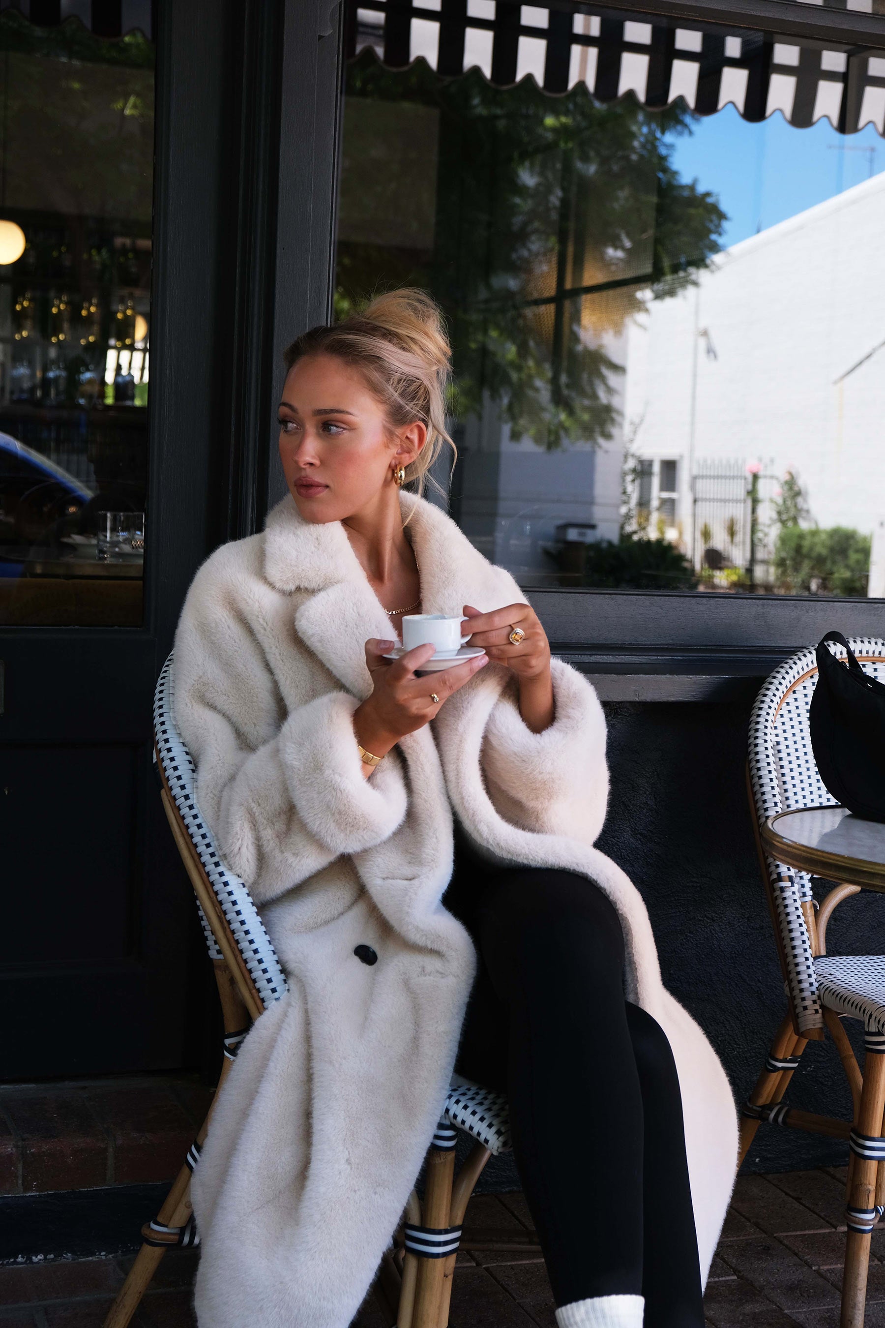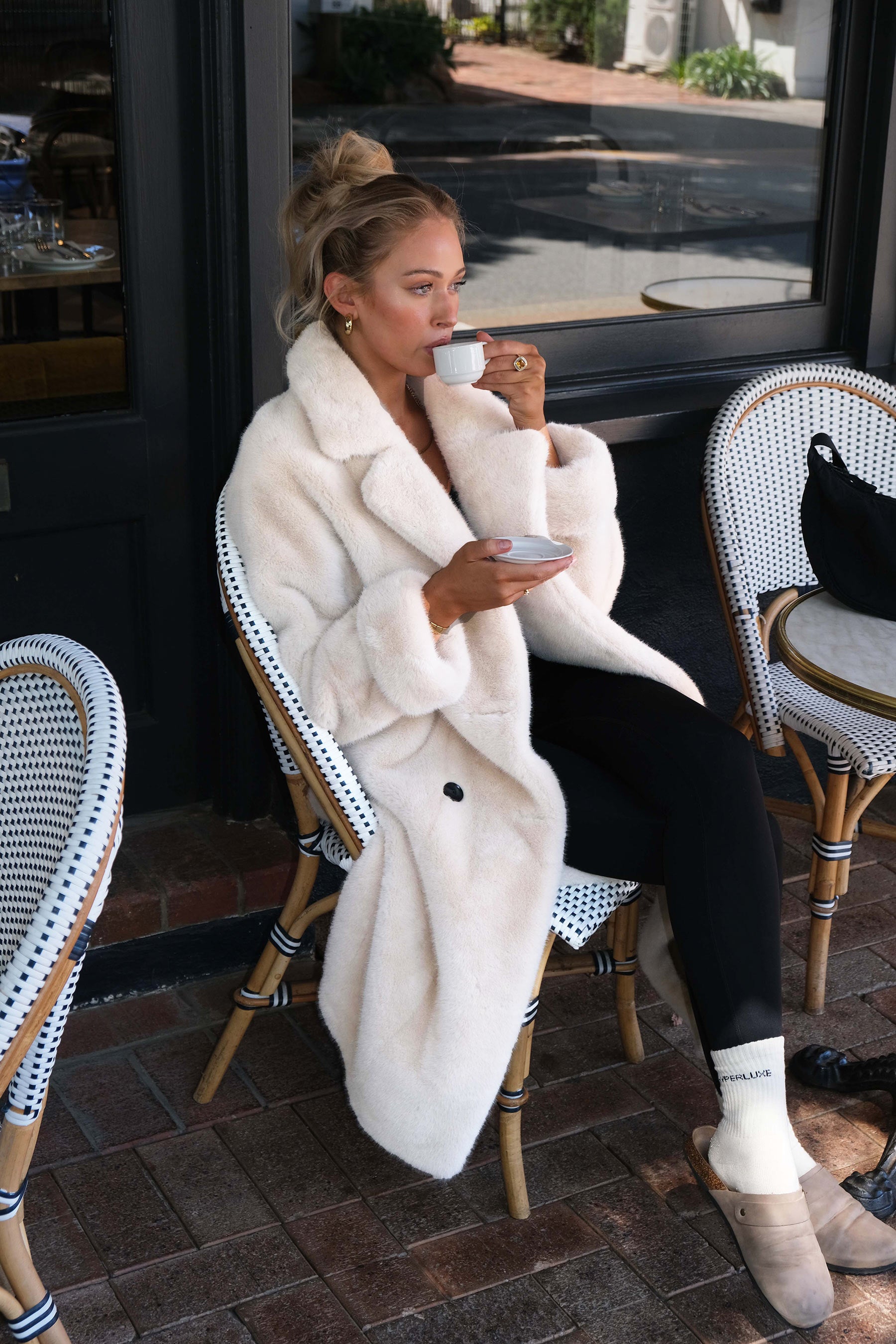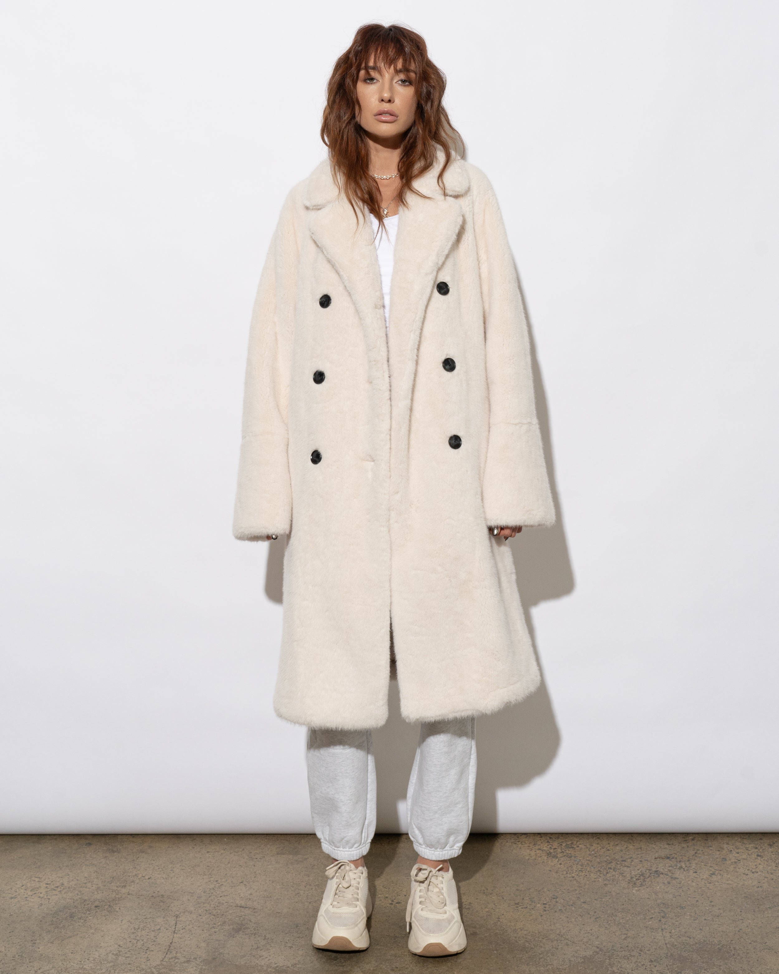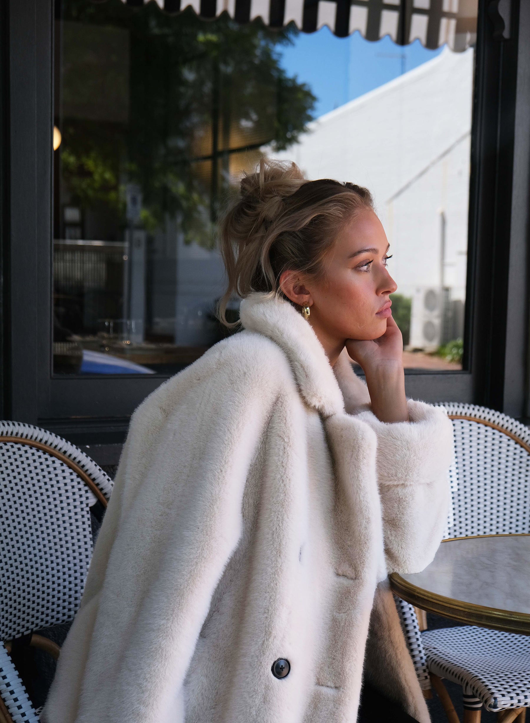 Conquer the chill in the ultra chic Willow Faux Fur Coat in Creme. This sumptuously soft winter essential combines neutral tones with a bold, sexy longline silhouette, perfect for the daring woman-on-a-mission. Embrace the cold weather with its statement chunky buttoned double-breasted closure, adjustable rolled cuffs, and deep set hip pockets keeping you toasty. Upgrade your urban style with this winter must-have.