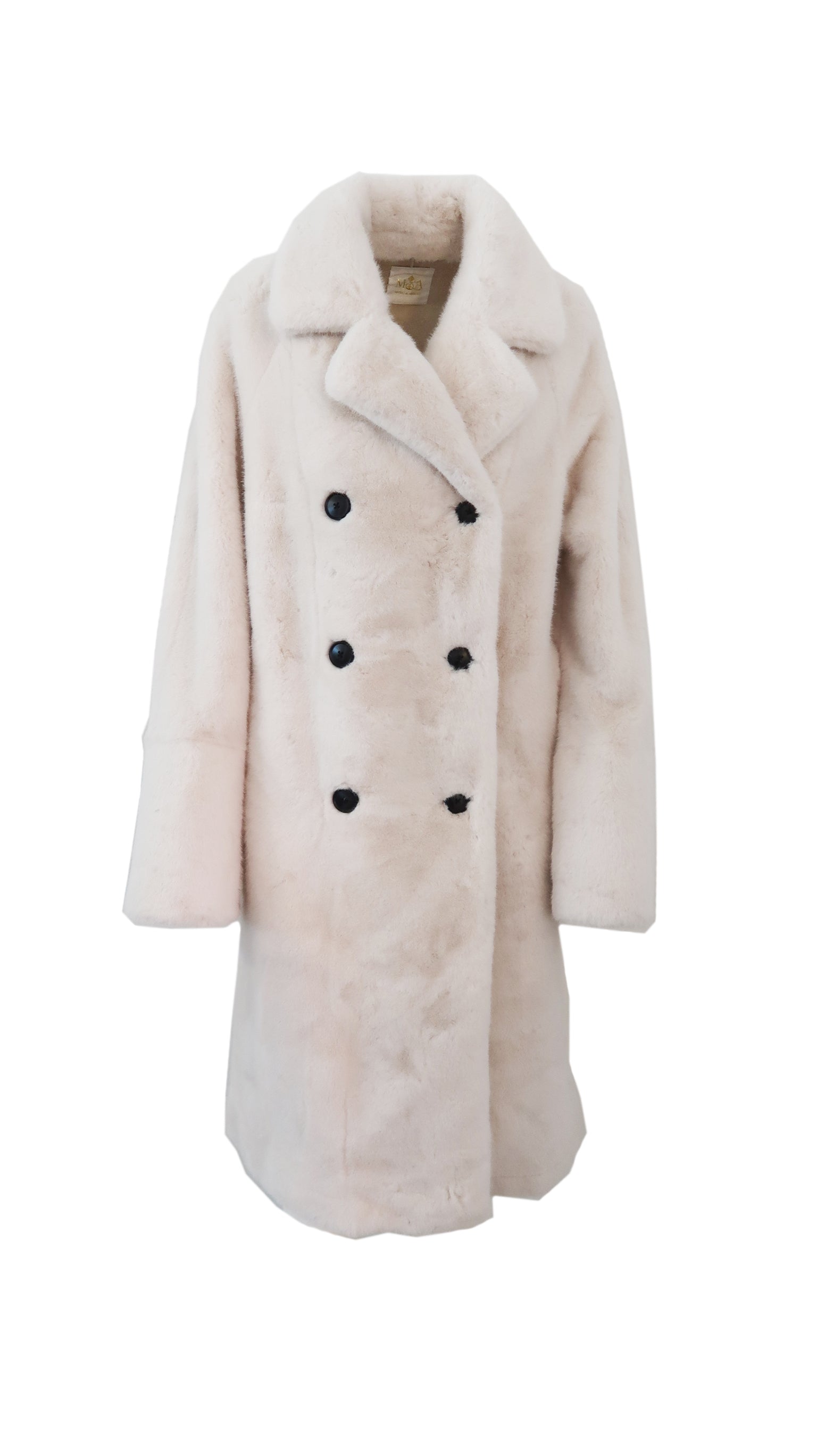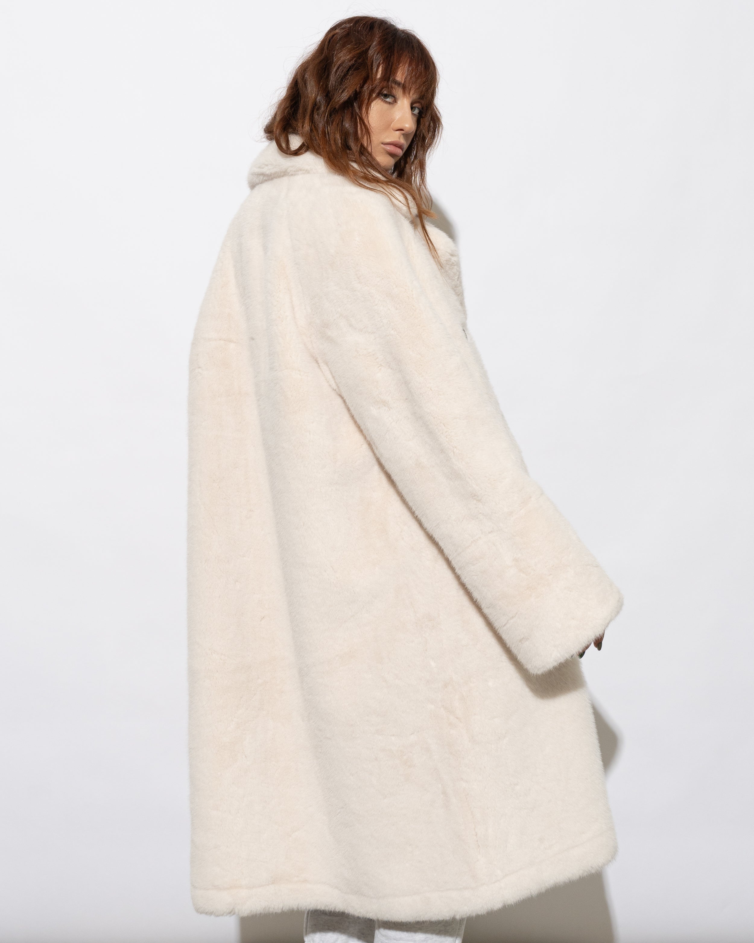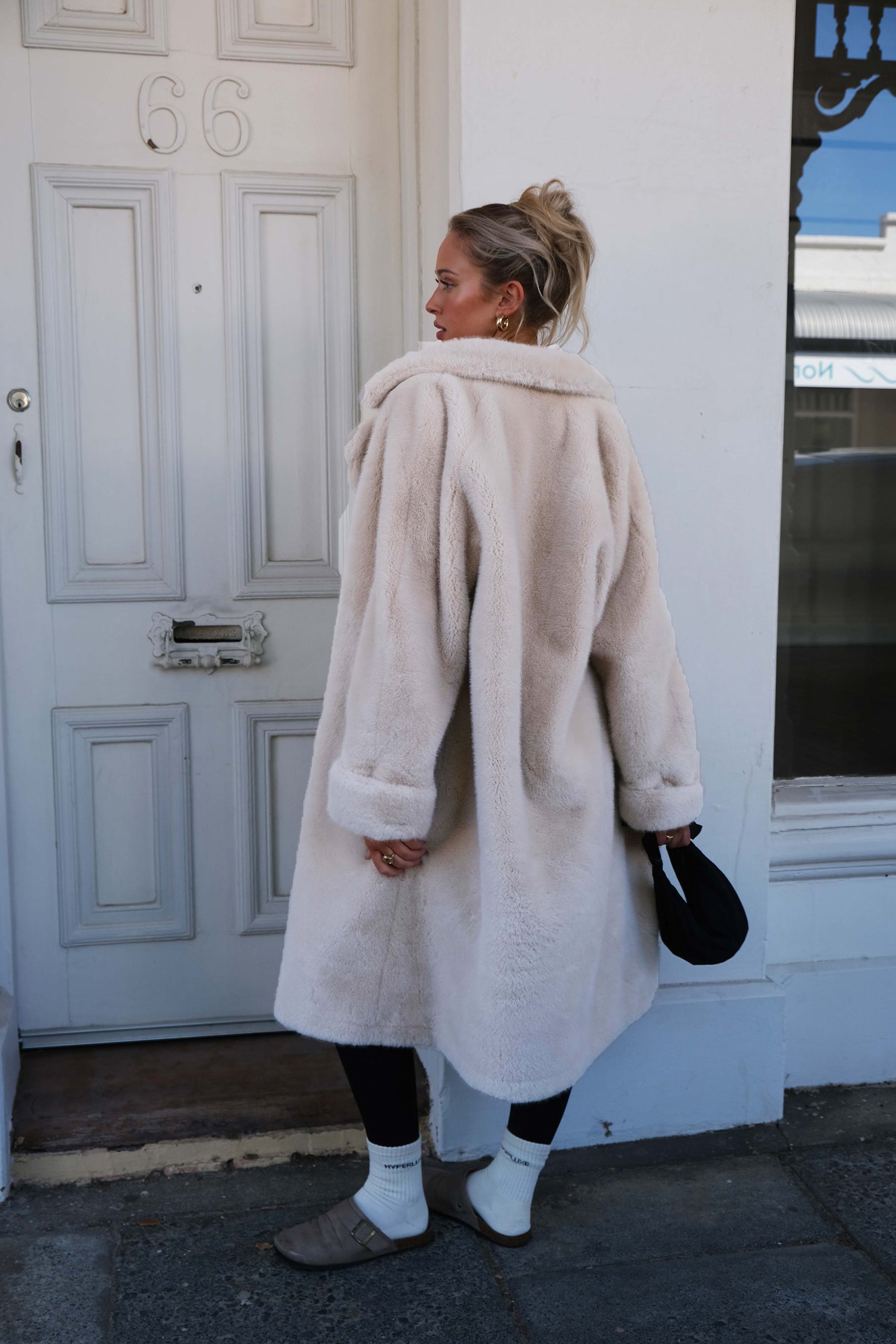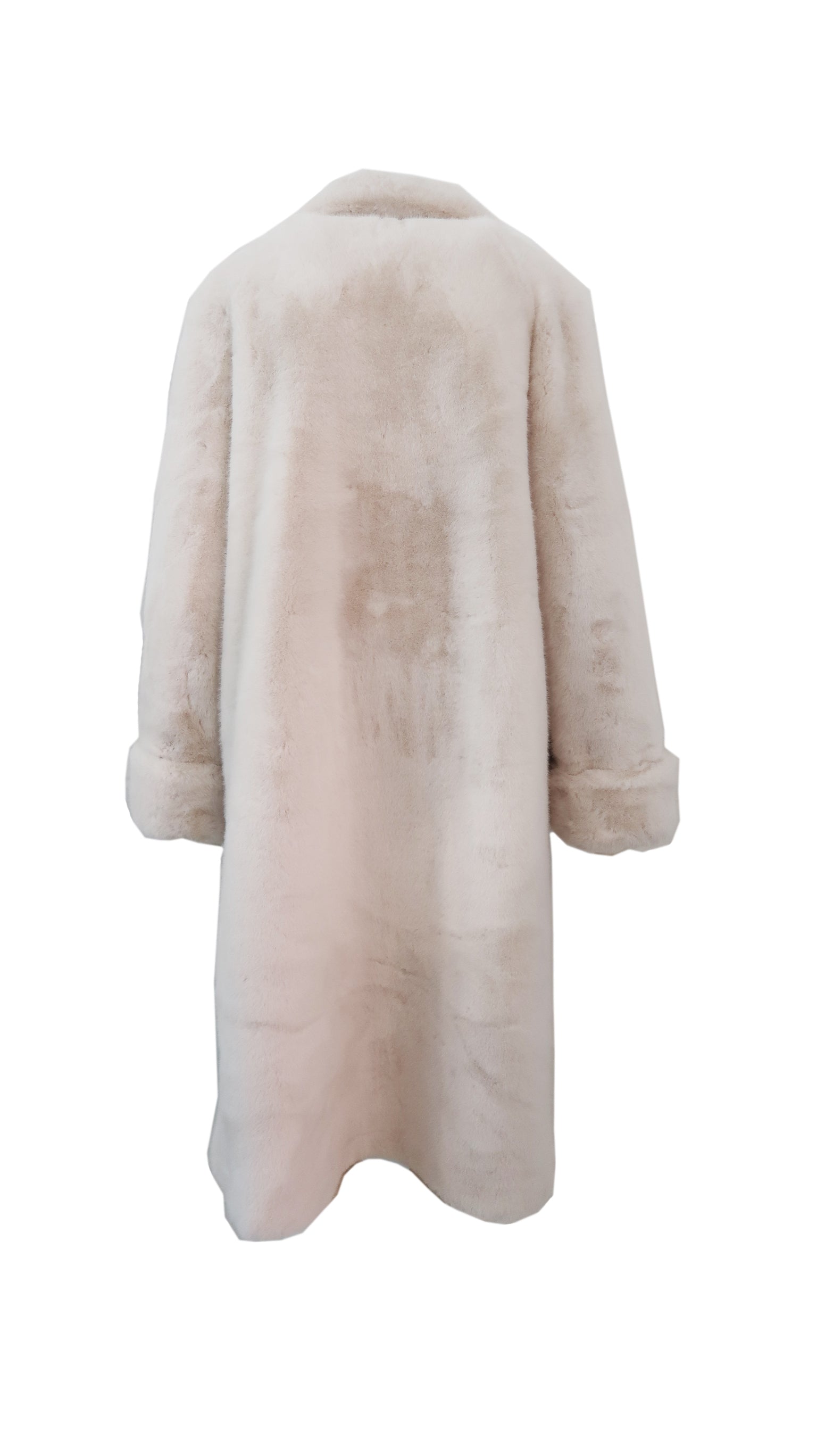Conquer the chill in the ultra chic Willow Faux Fur Coat in Creme. This sumptuously soft winter essential combines neutral tones with a bold, sexy longline silhouette, perfect for the daring woman-on-a-mission. Embrace the cold weather with its statement chunky buttoned double-breasted closure, adjustable rolled cuffs, and deep set hip pockets keeping you toasty. Upgrade your urban style with this winter must-have.